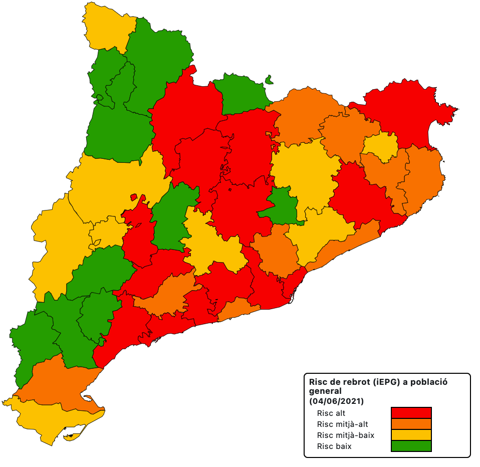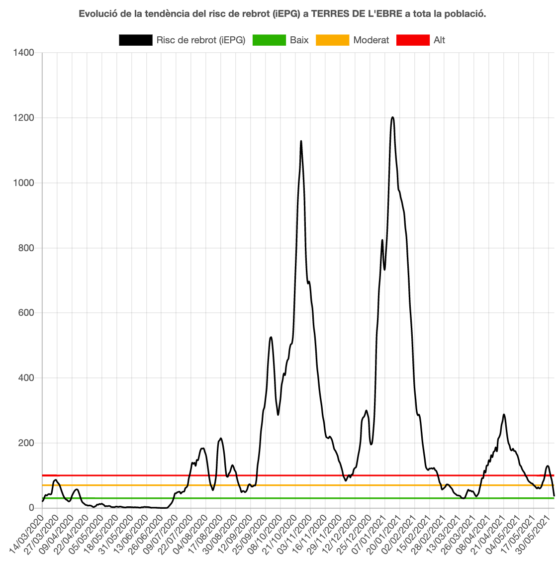 La velocitat de propagació de la Covid-19 (Rt) baixa a 0,56 a les Terres de l’Ebre, trenta-quatre centèsimes menys que ahir i com és inferior a l’1 significa que la pandèmia decreix. L’Rt ha sigut superior a l’1 durant més d’una setmana, en concret durant nou dies, des del dissabte dia 29 de maig fins al diumenge 6 de juny. El risc de rebrot també baixa i ho fa 24 punt fins a 36 (mitjà-baix). Per comarques, el risc de rebrot és baix a la Terra Alta amb 0 punts i a la Ribera d’Ebre amb 6 punts, mitjà-baix al Montsià amb 41, i mitjà-alt al Baix Ebre amb 77 punts.