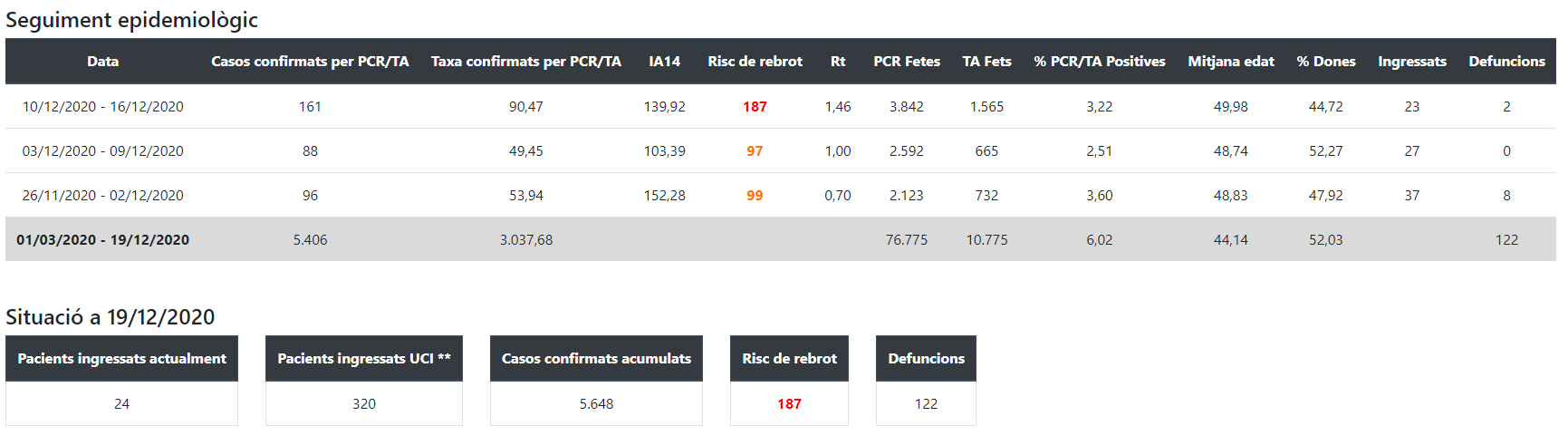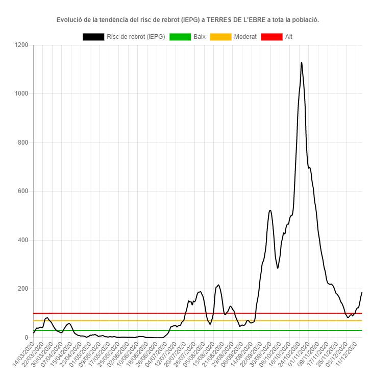 El risc de rebrot puja 19 punts i se situa en 187, per sobre del de la setmana anterior, quan era de 97. Per altra banda, la taxa de confirmats per PCR o test d’antígens entre el 10 i el 16 de desembre és de 90,47 per cada 100.000 habitants. La incidència a 14 dies és de 139,92, pels 103,39 de la setmana anterior. El 3,22% de les proves que es fan donen positiu.