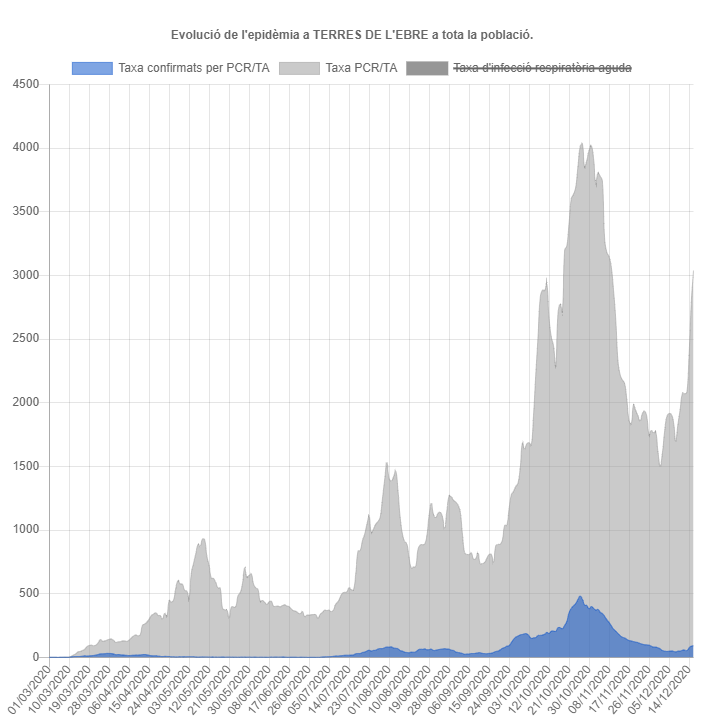 La regió sanitària de les Terres de l’Ebre acumula, des de l’inici de la pandèmia, 5.406 casos confirmats per PCR o antígens, 19 més que en el balanç anterior, i 5.648 si es tenen en compte la resta de proves. En aquesta regió han mort 122 persones, cap més respecte ahir. Entre el 10 i el 16 de desembre es va notificar dues defuncions i cap més en l’interval anterior.