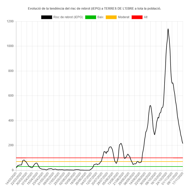 El risc de rebrot baixa 13 punts i se situa en 215 punts, per sota del de la setmana anterior, quan era de 406. Per altra banda, la taxa de confirmats per PCR o tests d’antígens entre l’11 i el 17 de novembre és de 125,31 per cada 100.000 habitants. La incidència a 14 dies és de 348,38, pels 601,24 de la setmana anterior.