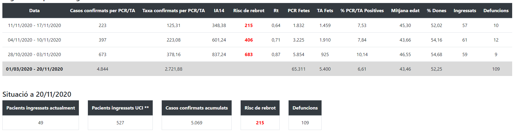El risc de rebrot baixa 13 punts i se situa en 215 punts, per sota del de la setmana anterior, quan era de 406. Per altra banda, la taxa de confirmats per PCR o tests d’antígens entre l’11 i el 17 de novembre és de 125,31 per cada 100.000 habitants. La incidència a 14 dies és de 348,38, pels 601,24 de la setmana anterior.