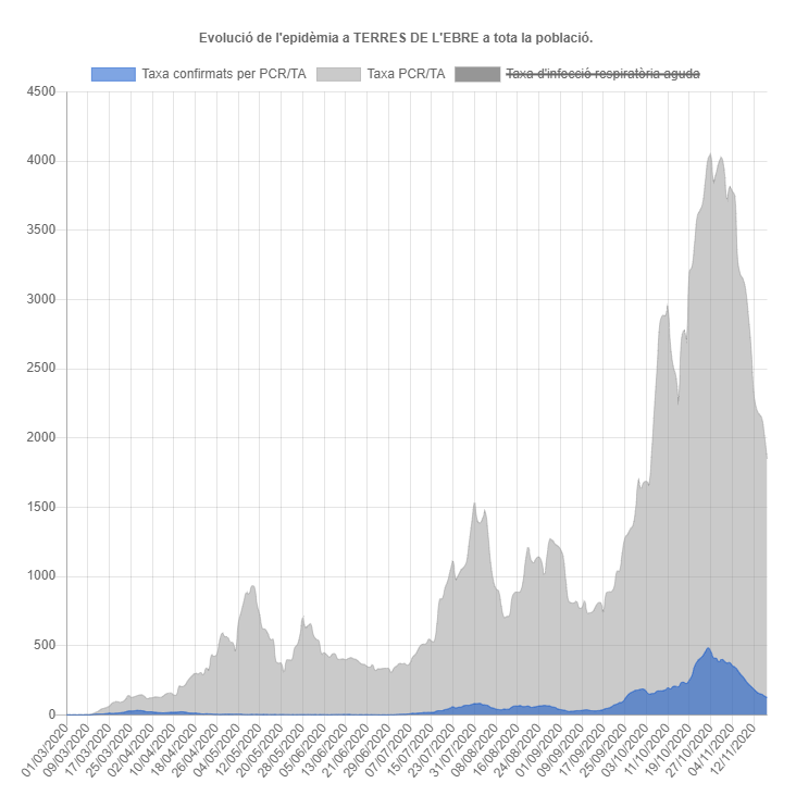 La regió sanitària de les Terres de l’Ebre acumula, des de l’inici de la pandèmia, 4.844 casos confirmats per PCR o antígens (29 més que en el balanç anterior), 5.069 si es tenen en compte la resta de proves (31 més). En aquesta regió han mort 109 persones, 2 més que en el balanç anterior. Entre l’11 i el 17 de novembre es van notificar 10 defuncions, 12 en l’interval anterior.