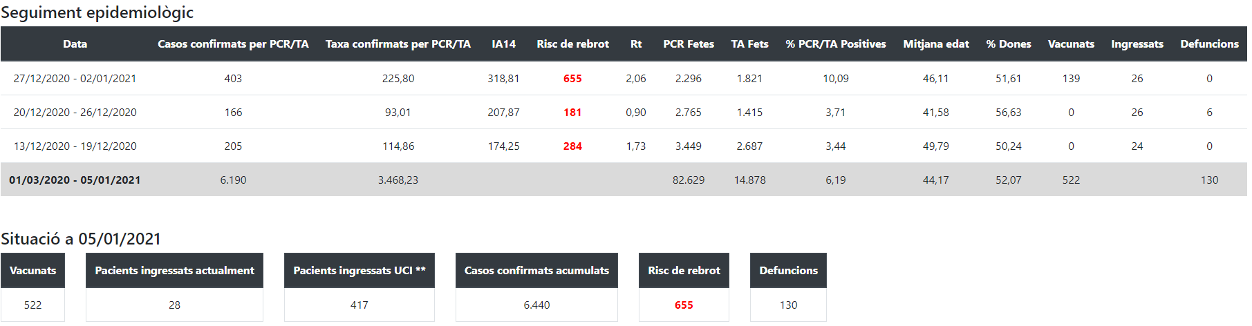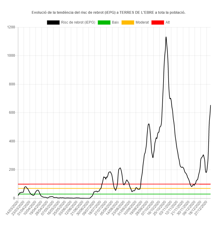El risc de rebrot puja 82 punts i se situa en 655, per sobre del de la setmana anterior, quan era de 161. D’altra banda, la taxa de confirmats per PCR o tests d’antígens entre el 27 de desembre i el 2 de gener és de 225,80 per cada 100.000 habitants. La incidència a 14 dies és de 318,81, pels 207,87 de la setmana anterior. El 10,09% de les proves que es fan donen positiu.
