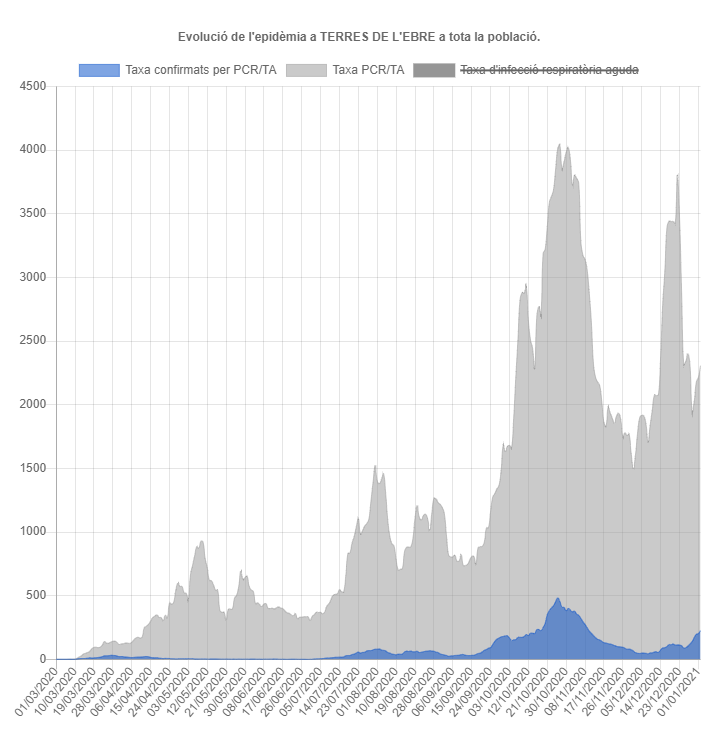 La regió sanitària de les Terres de l’Ebre acumula, des de l’inici de la pandèmia, 6.190 casos confirmats per PCR o antígens, 90 més que en el balanç anterior, i 6.440 si es tenen en compte la resta de proves. En aquesta regió han mort 130 persones, cap més que en el balanç anterior. Entre el 27 de desembre i el 2 de gener no es va notificar cap mort, sis en l’interval anterior. Hi ha 522 vacunats, 351 més que ahir.
