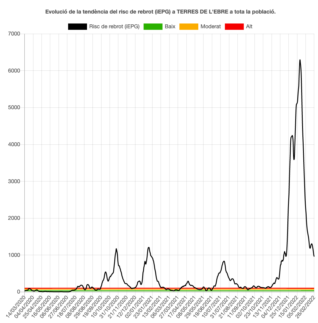La pandèmia va a la baixa, ja que la velocitat de contagi (Rt) és inferior a l’1 i se situa al 0,85. El risc de rebrot també disminueix i ja se situa per sota dels 1.000 punts, a 957 (risc molt alt). A hores d’ara tenen un risc molt alt les quatre comarques: la Ribera d’Ebre de 903, el Montsià de 688, la Terra Alta de 1.147 i el Baix Ebre de 1.207.