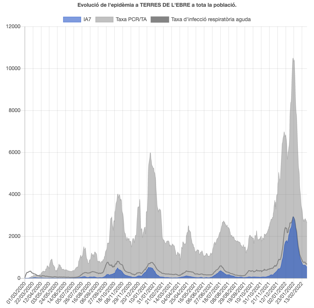 Segons dadescovid.cat, actualment hi ha 43 persones ingressades per Covid-19, 6 de les quals a l’UCI. A les Terres de l’Ebre han mort 241 persones des de l’inici de la pandèmia. Les últimes defuncions daten del 9 de febrer i el 27 de març. La incidència a 7 dies és de 540 i a 14 dies és de 1.160. El 15,05% de les proves que es fan donen positiu.