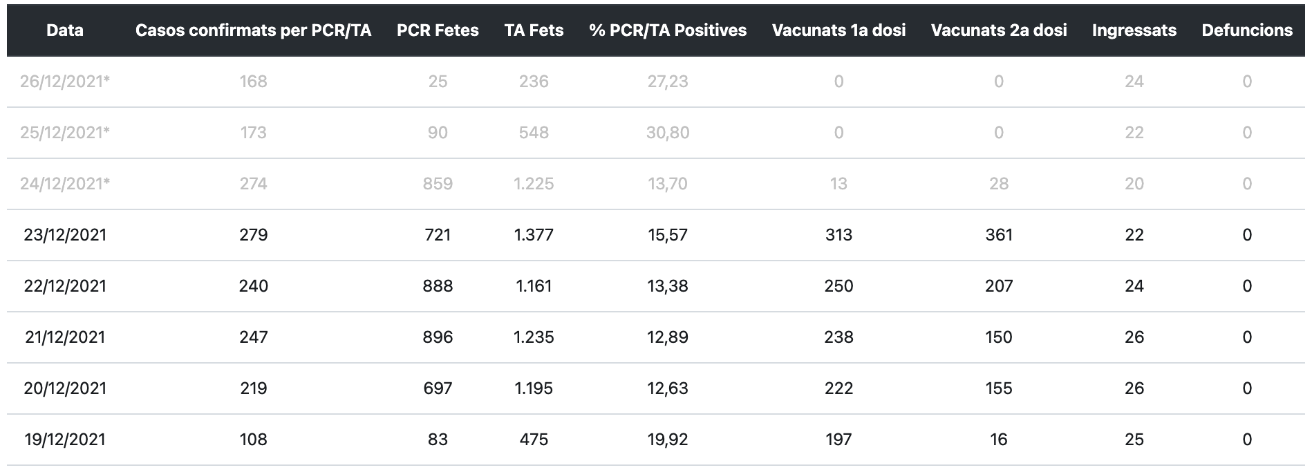 Aquest dilluns s’han sumat 260 positius a les Terres de l’Ebre i des de l’inici de la pandèmia s’han detectat 19.365 casos. Si mirem el portal dadescovid.cat que mostra les xifres diàries exactes, la dada rècord és del 23 de desembre amb 279 casos de Covid-19, la dada més alta de tota la pandèmia. A continuació podeu veure les dades diàries: