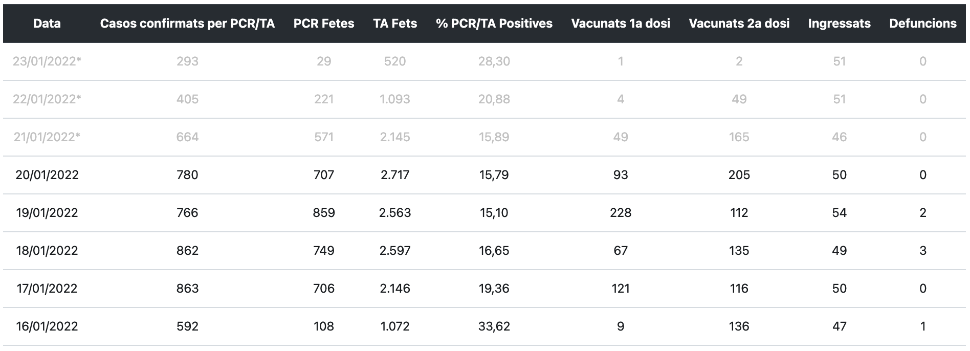 Si mirem el portal dadescovid.cat que mostra les xifres diàries exactes, el rècord és del dia 17 de gener amb 863 casos de Covid-19. A continuació podeu veure les dades diàries: