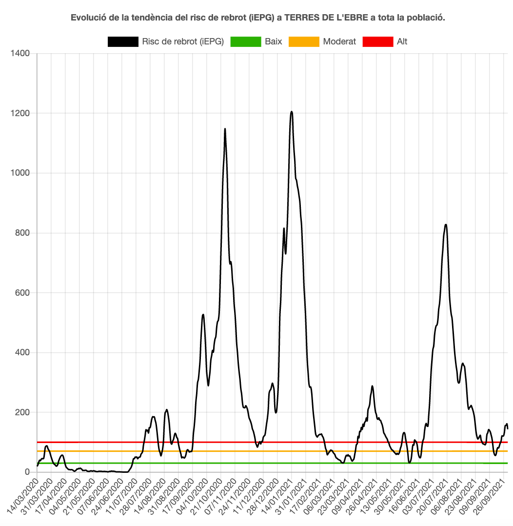 La velocitat de contagi (Rt) és superior a l’1, però baixa disset centèsimes fins a 1,26. El risc de rebrot baixa 17 punts fins a 143, risc alt. Té un risc baix la Ribera d’Ebre (8), mitjà-alt el Montsià (89) i molt alt el Baix Ebre (214) i la Terra Alta (305).