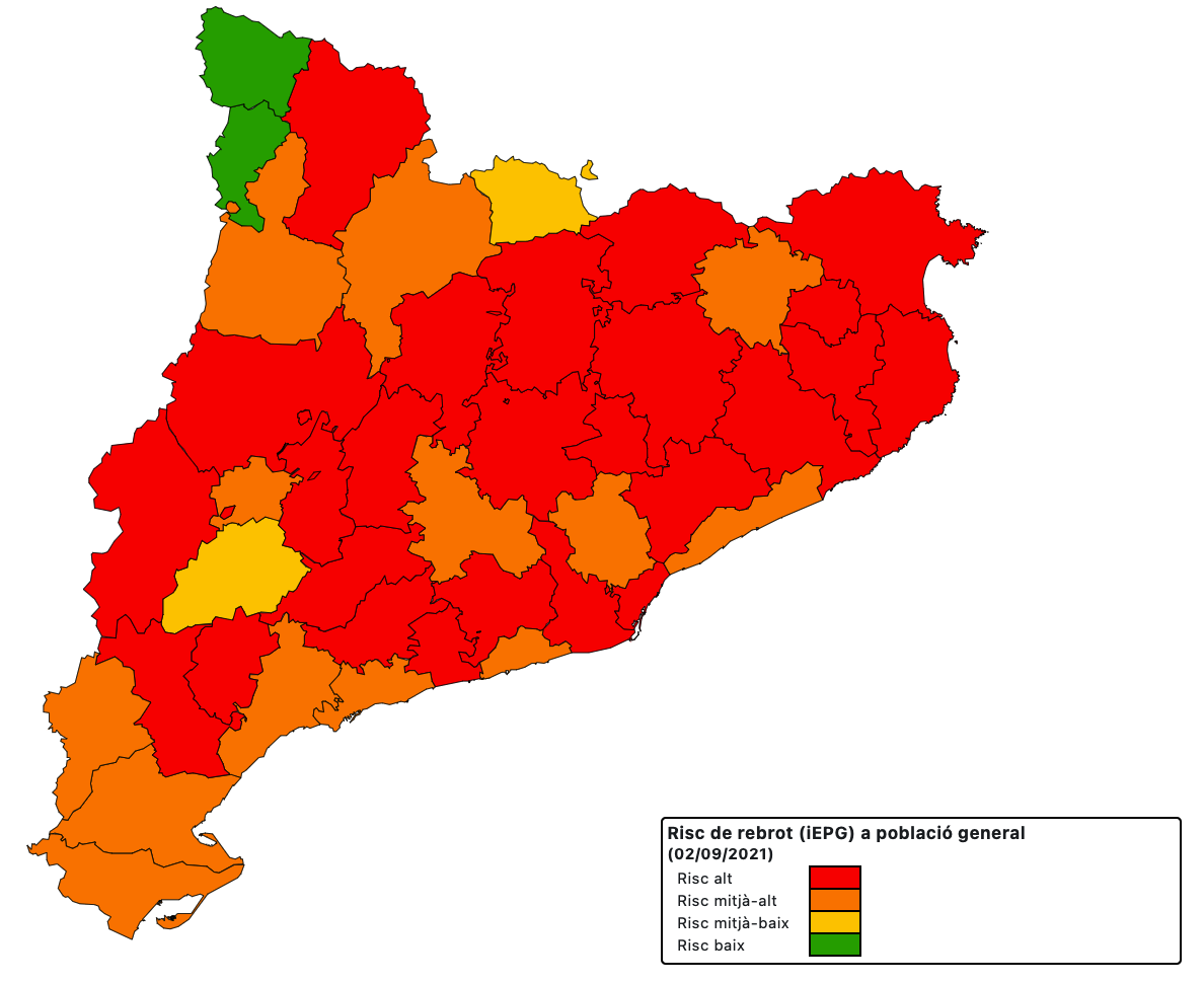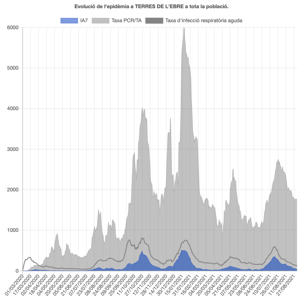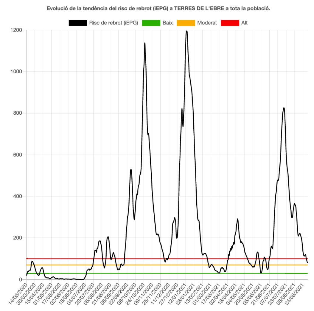 La pandèmia segueix a la baixa, ja que la velocitat de contagi (Rt) a les Terres de l’Ebre és inferior a l’1. En concret, baixa una centèsima fins a 0,79. El risc de rebrot baixa 4 punts i és de 80, mitjà-alt, i no era tan baix des del 19 de juny. Té un risc mitjà-baix la Terra Alta (92), el Baix Ebre (70) i el Montsià (95) i alt la Ribera d’Ebre (121).