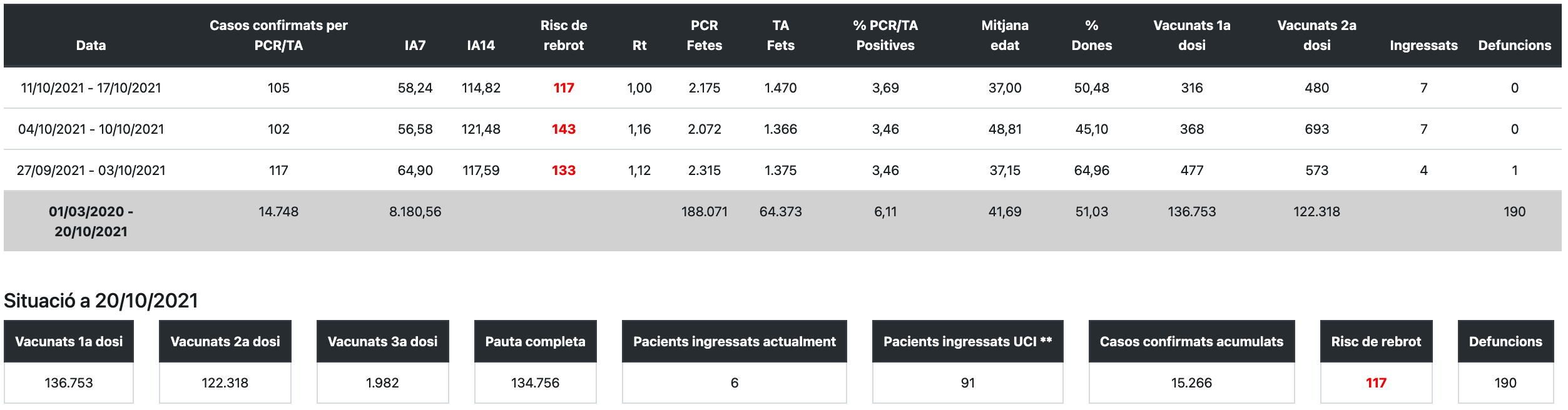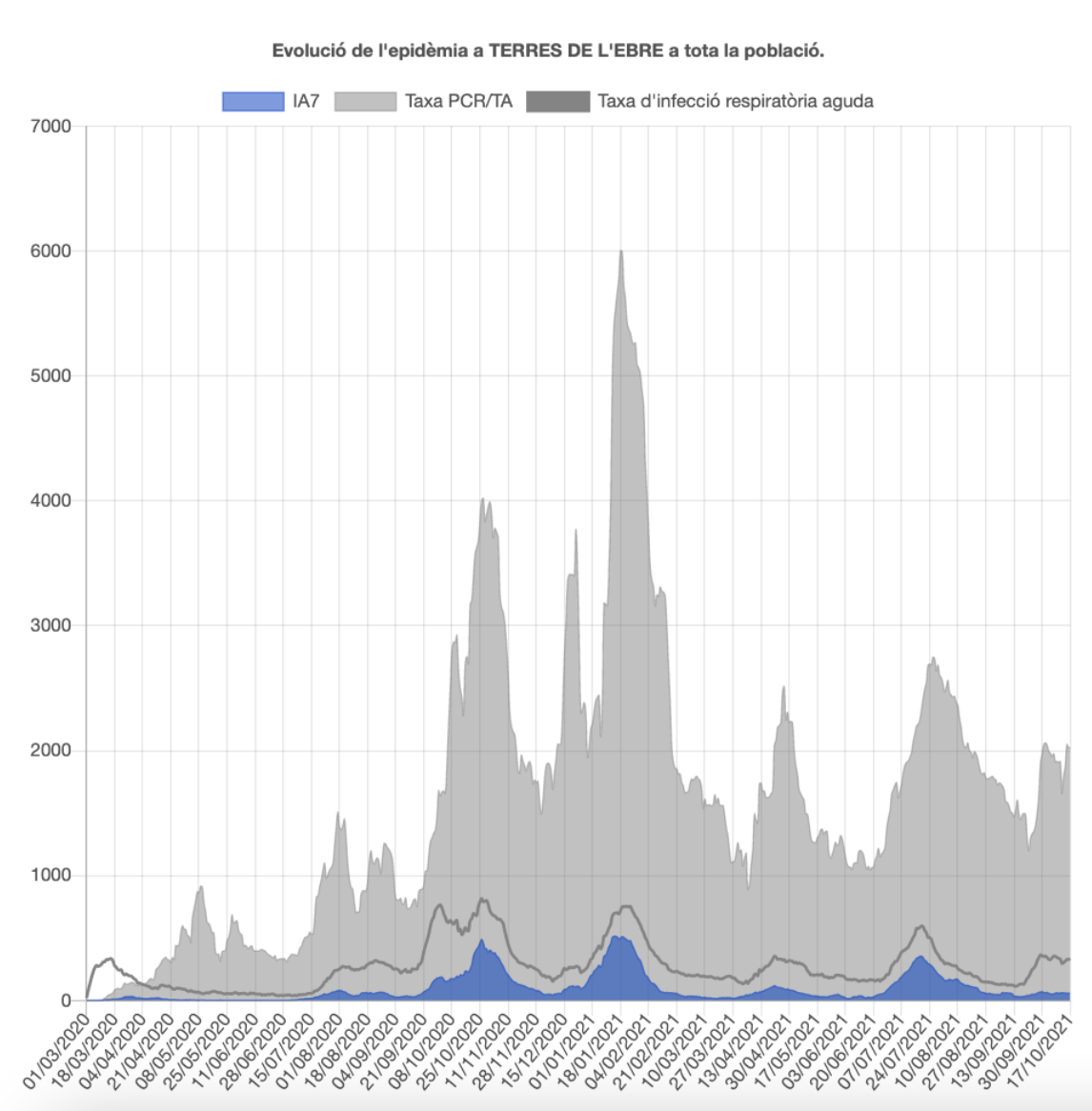 Segons dadescovid.cat, hi ha 9 persones ingressades per Covid-19, igual que ahir, 3 de les quals a l’UCI. A les Terres de l’Ebre han mort 190 persones des de l’inici de la pandèmia, cap més. Les dues últimes defuncions daten de l’11 i del 30 de setembre. La incidència a 7 dies és de 58 i a 14 dies és de 115. El 3,69% de les proves que es fan donen positiu.