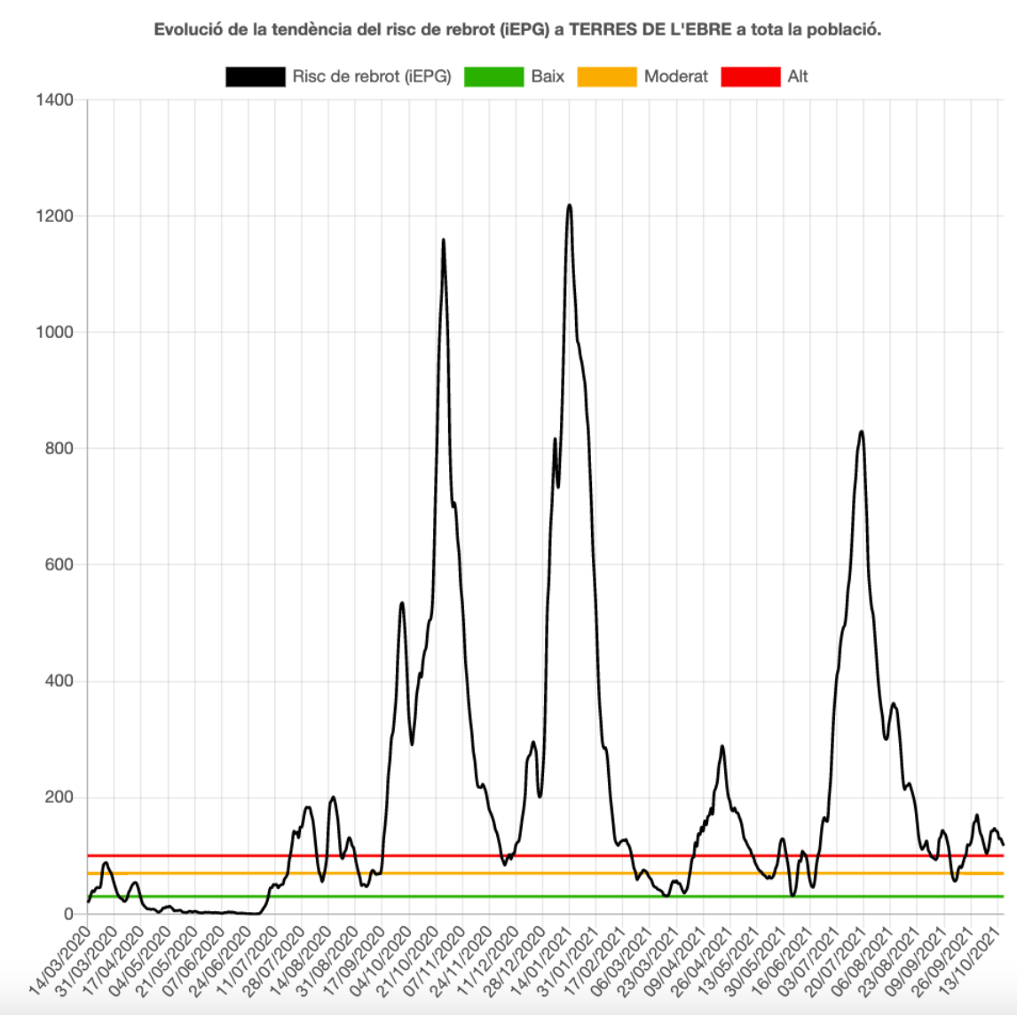 La velocitat de contagi (Rt) baixa una centèsima fins a 1 i el risc de rebrot també baixa una mica i ho fa sis punts fins a 117, risc alt. Té un risc mitjà-baix la Ribera d’Ebre (39), alt el Montsià (159) i el Baix Ebre (148) i molt alt la Terra Alta (307).