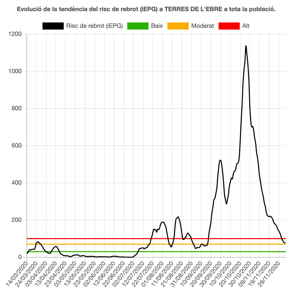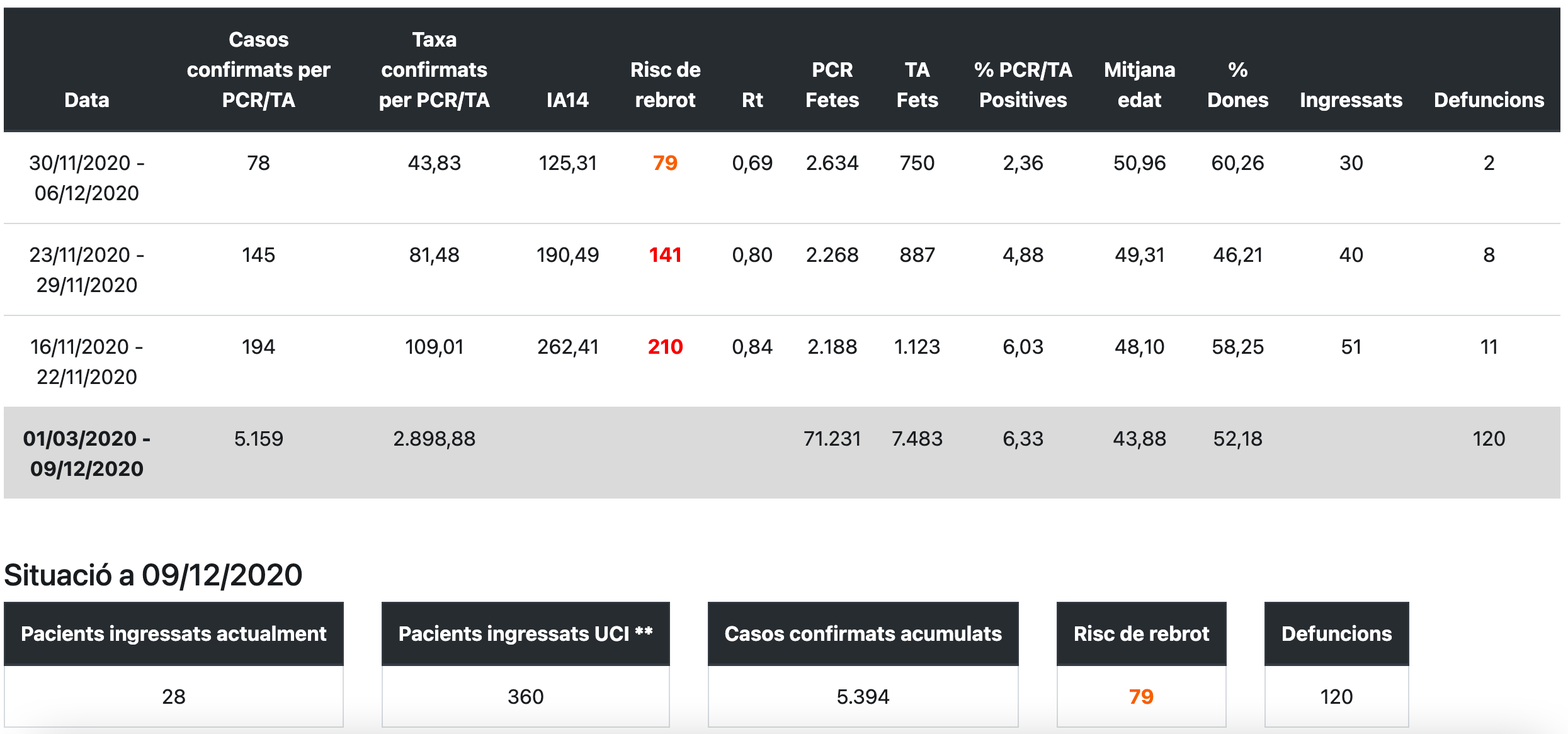 El risc de rebrot puja 3 punts i se situa en 79, per sota del de la setmana anterior, quan era de 141. Per altra banda, la taxa de confirmats per PCR o tests d’antígens entre el 30 de novembre i el 6 de desembre és de 43,83 per cada 100.000 habitants. La incidència a 14 dies és de 125,31, pels 190,49 de la setmana anterior. El 2,36% de les proves que es fan donen positiu.