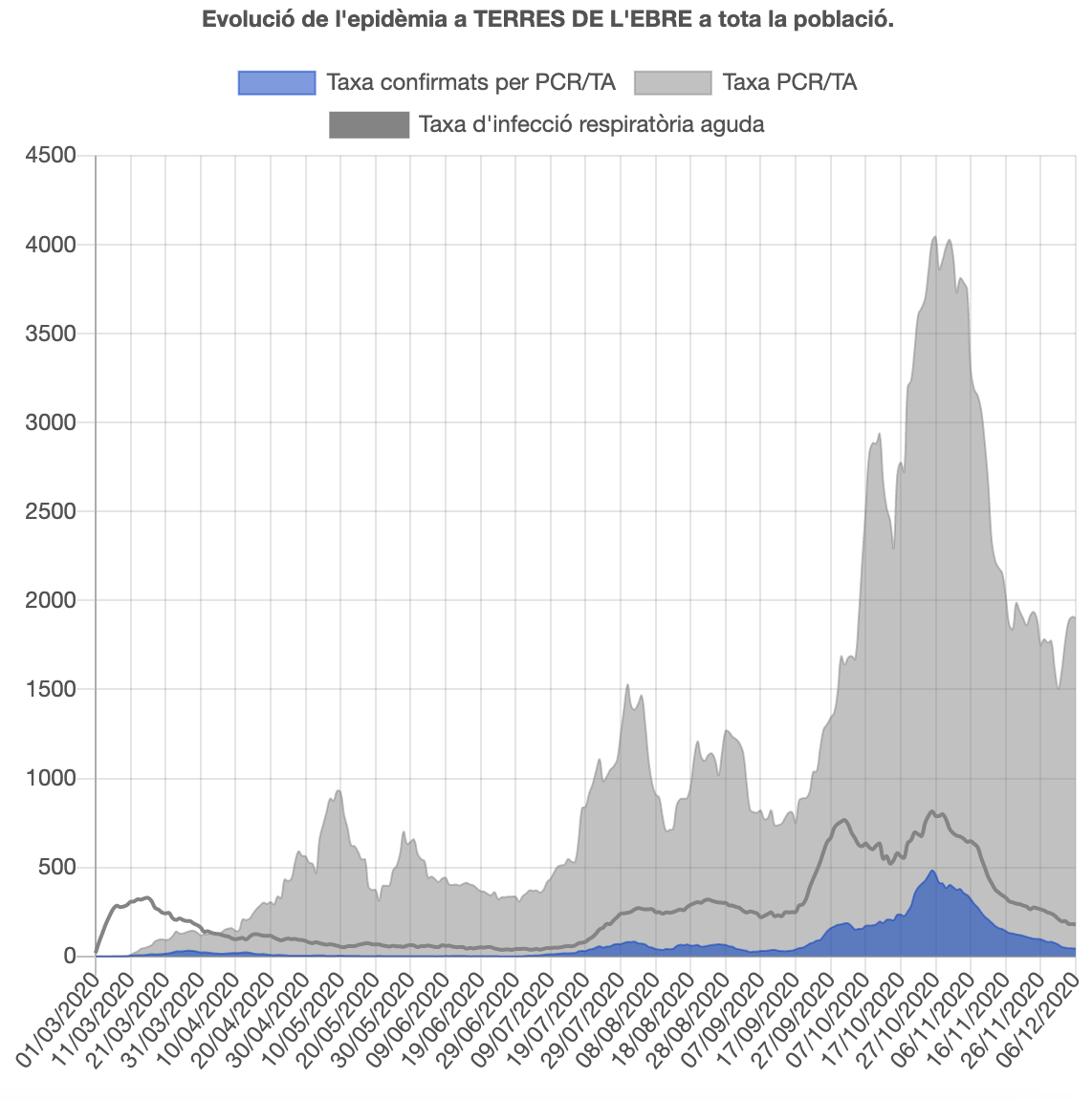 La regió sanitària de les Terres de l’Ebre acumula, des de l’inici de la pandèmia, 5.159 casos confirmats per PCR o antígens, 22 més que en el balanç anterior, 5.394 si es tenen en compte la resta de proves. En aquesta regió han mort 120 persones, cap més que en el balanç anterior. Entre el 30 de novembre i el 6 de desembre es van notificar 2 defuncions, 8 en l’interval anterior.