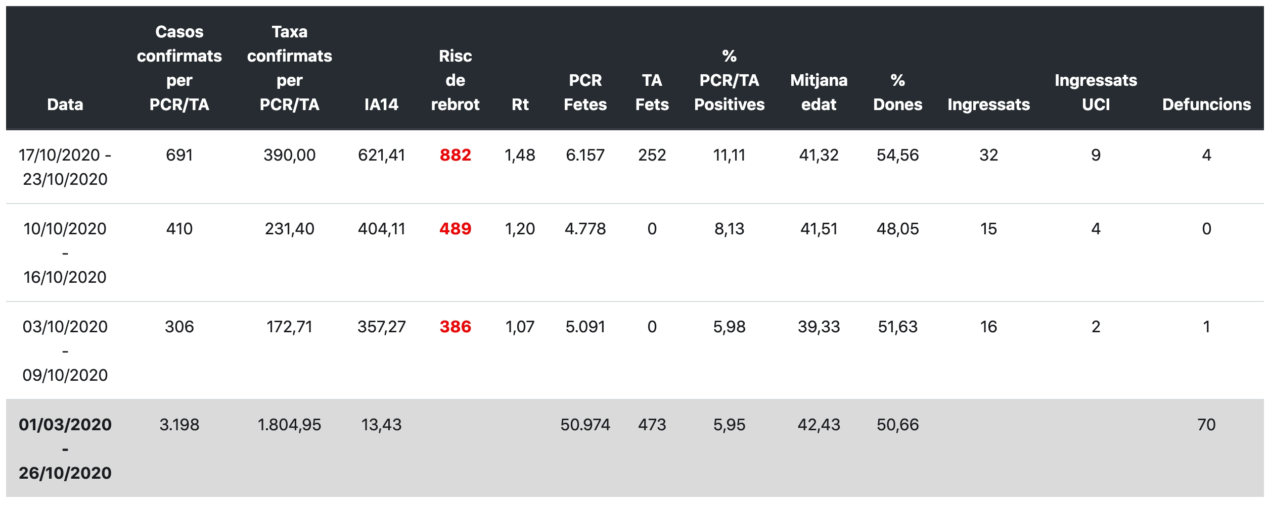 El risc de rebrot puja 178 punts i ara se situa proper als 900 punts, a 882. La setmana anterior era de 489. Per altra banda, la taxa de confirmats per PCR o tests d’antígens en els darrers set dies és de 390 per cada 100.000 habitants. La incidència a 14 dies és de 621,41, pels 374,76 de la setmana anterior.