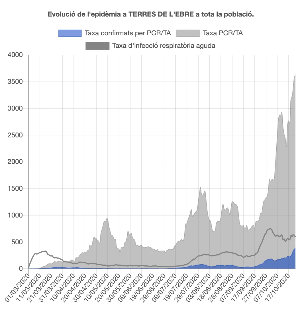 La regió sanitària de les Terres de l’Ebre acumula, des de l’inici de la pandèmia, 3.198 casos confirmats per PCR o antígens, 253 més que en el balanç anterior, i 3.398 si es tenen en compte la resta de proves. En aquesta regió han mort 70 persones, una més que en l’últim balanç. Entre el 17 i el 23 d’octubre es van notificar quatre defuncions, cap en l’interval anterior.