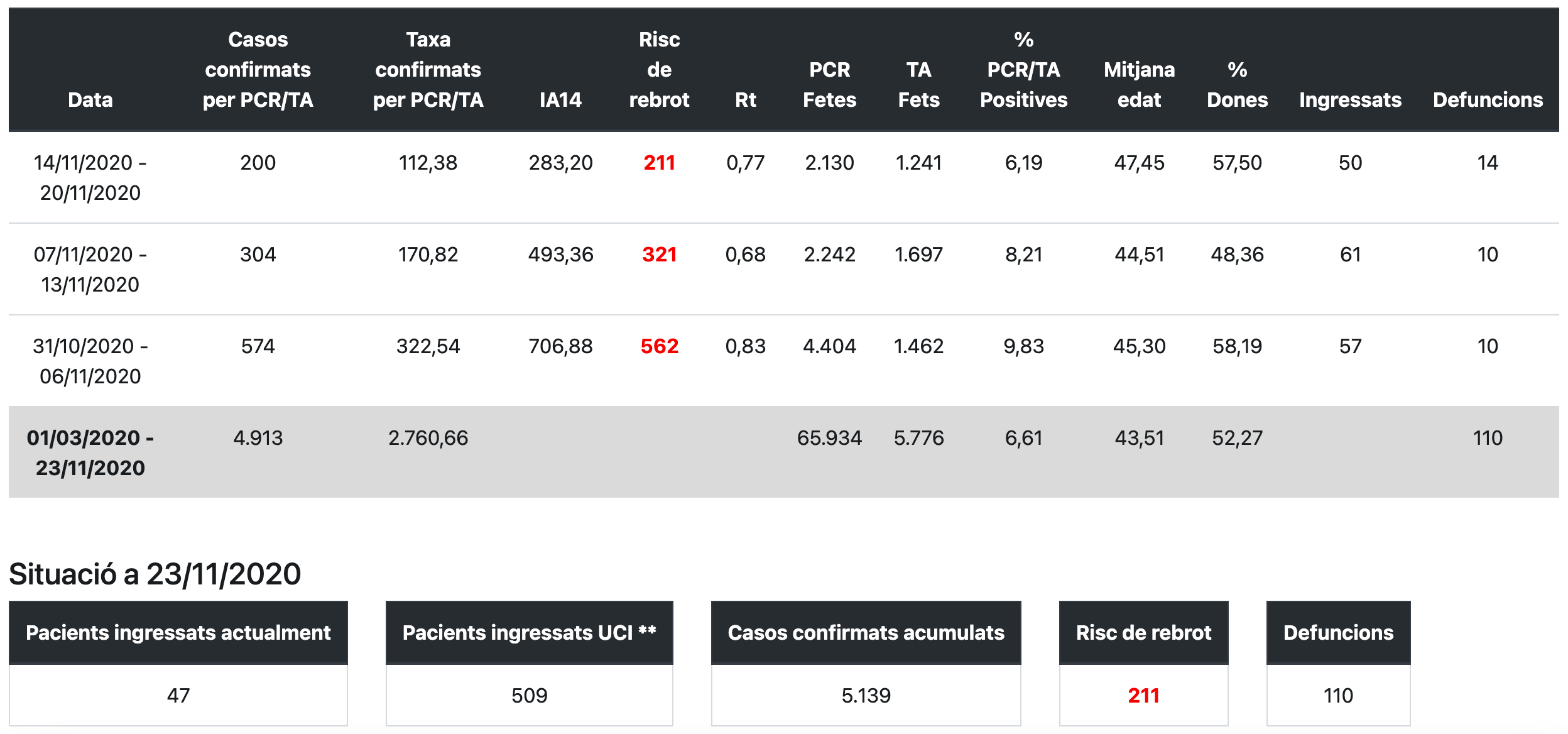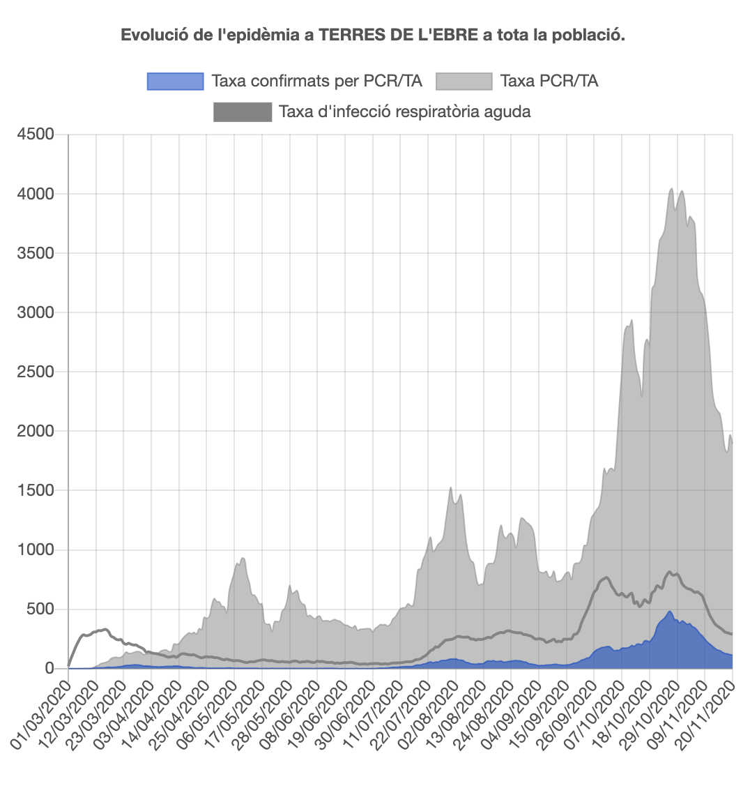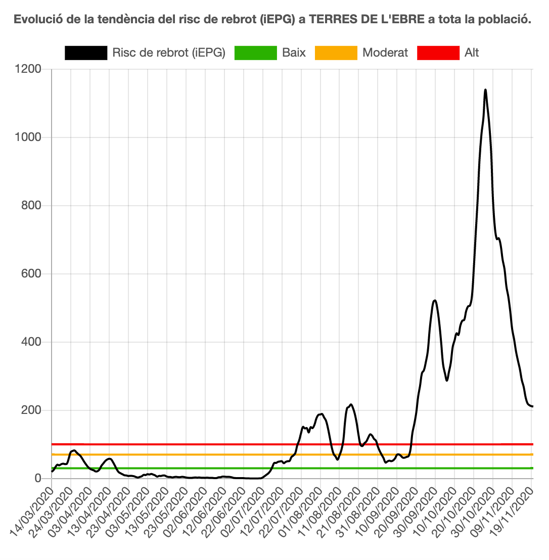 La regió sanitària de les Terres de l’Ebre acumula, des de l’inici de la pandèmia, 4.913 casos confirmats per PCR o antígens, 34 més que en el balanç anterior, 5.139 si es tenen en compte la resta de proves, en total 35 més. En aquesta regió han mort 110 persones, igual que en el balanç anterior. Entre el 14 i el 20 de novembre es van notificar 14 defuncions, 10 en la setmana anterior. El risc de rebrot puja un punt i se situa en 211, per sota del de la setmana anterior, quan era de 321. Per altra banda, la taxa de confirmats per PCR o tests d’antígens és de 112,38 per cada 100.000 habitants. La incidència a 14 dies és de 283,20, pels 493,36 de la setmana anterior.