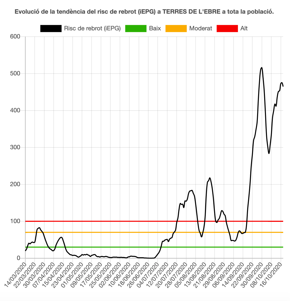 Tortosa registra un risc de rebrot de 940,31, 37,08 punts menys que en l’últim balanç. La setmana anterior era de 1.006,49. La velocitat de propagació és d’1,03 i se situa per davall de l’interval de la setmana anterior que era d’1,15. La taxa de confirmats per PCR/TA està en 417,86 per cada 100.000 habitants. En total s’han detectat des de l’inici de la padèmia 826, 9 més que ahir.
