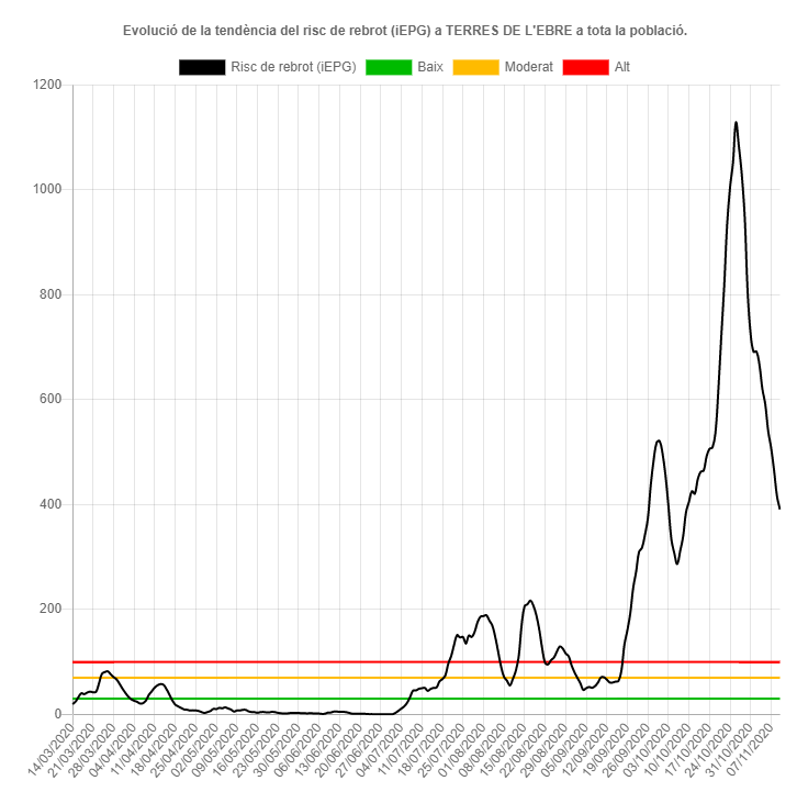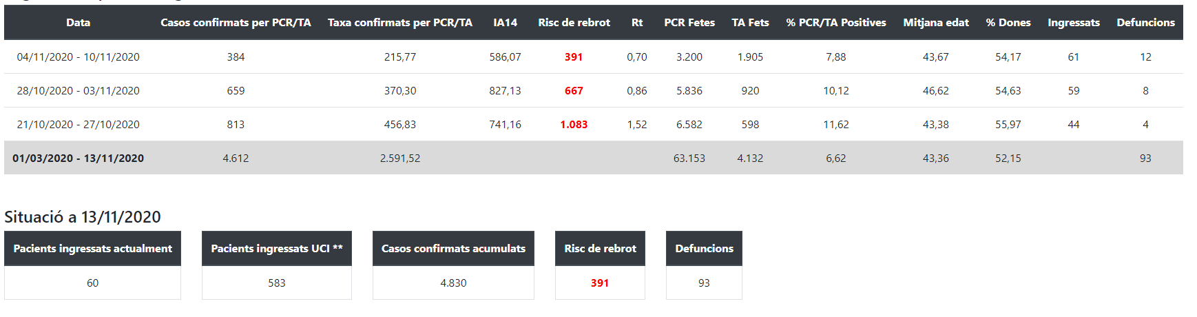 El risc de rebrot baixa 19 punts i se situa en 391 punts. La setmana anterior era de 667. La taxa de confirmats per PCR o tests d’antígens entre el 4 i el 10 de novembre és de 215,77 per cada 100.000 habitants. La incidència a 14 dies és de 586,07, pels 827,13 de la setmana anterior.