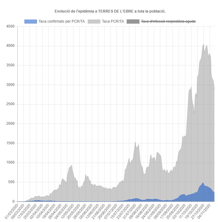 La regió sanitària de les Terres de l’Ebre acumula, des de l’inici de la pandèmia, 4.612 casos confirmats per PCR o antígens, 44 més que en el balanç anterior, 4.830 si es tenen en compte la resta de proves (45 més). En aquesta regió han mort 93 persones, cap més que en el balanç anterior. Entre el 4 i el 10 de novembre es van notificar 12 defuncions, 8 en l’interval anterior.