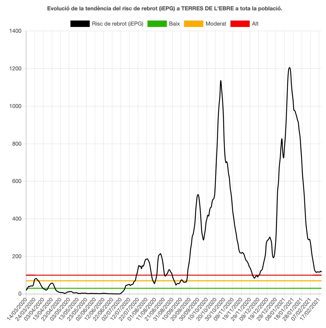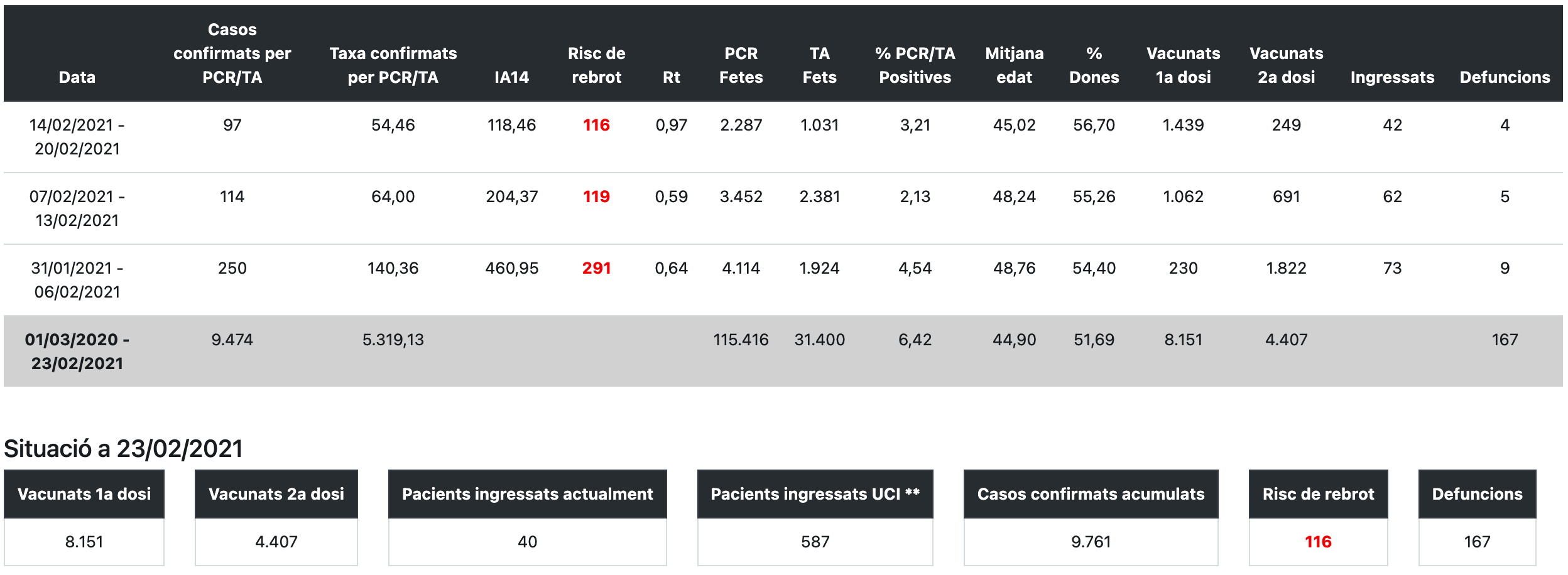 La taxa de confirmats per PCR o tests d’antígens entre el 14 i el 20 de febrer és de 54 per cada 100.000 habitants i s’han detectat 97 casos durant aquest període a les comarques ebrenques. El 3,21% de les proves de la darrera setmana han donat positiu. L’Organització Mundial de la Salut (OMS) considera que l’ideal és que el percentatge de proves positives se situï per sota del 5%, però en aquesta tercera onada s’havia arribat al 12,58% a les Terres de l’Ebre, concretament a començaments de gener.