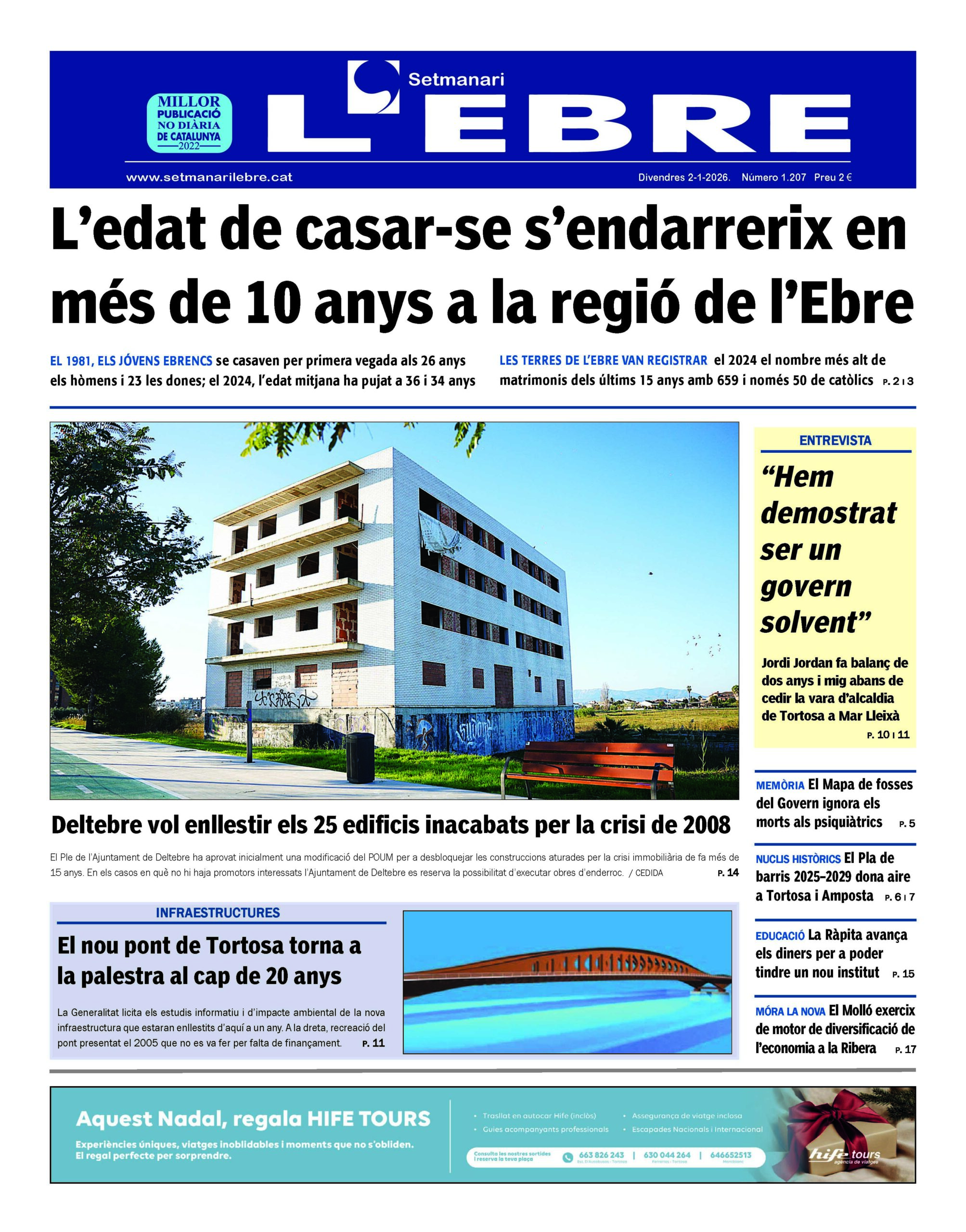 La portada de l’edició en paper número 1207 del Setmanari l’Ebre (el primer de l’any) dedica el titular principal a la tendència dels ebrencs i ebrenques a casar-se 10 anys més tard del que ho feien de mitjana el 1981. Ara, els hòmens es casen als 36 i les dones, als 34.