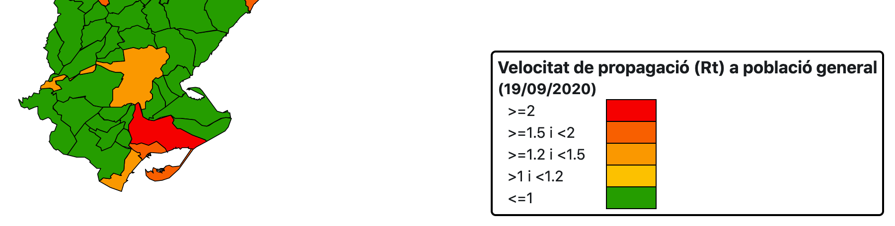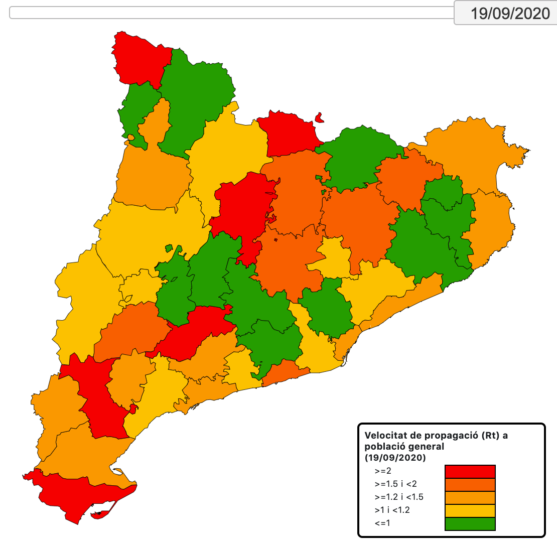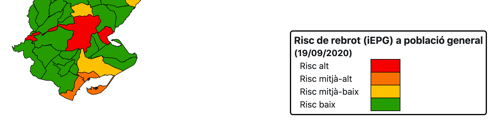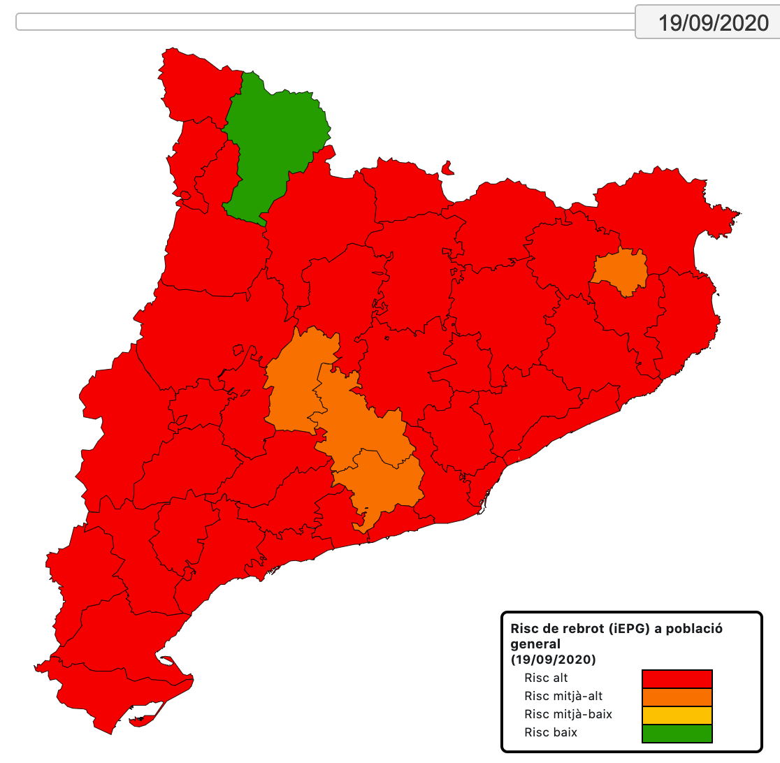 El portal dadescovid.cat mostra diàriament un mapa amb els canvis comarcals i municipals de la pandèmia del coronavirus. Avui, 23 de setembre, el mapa que trobem en aquesta web sobre risc de rebrot és el següent: