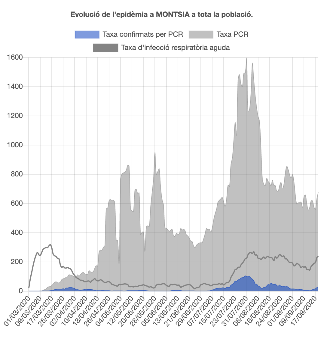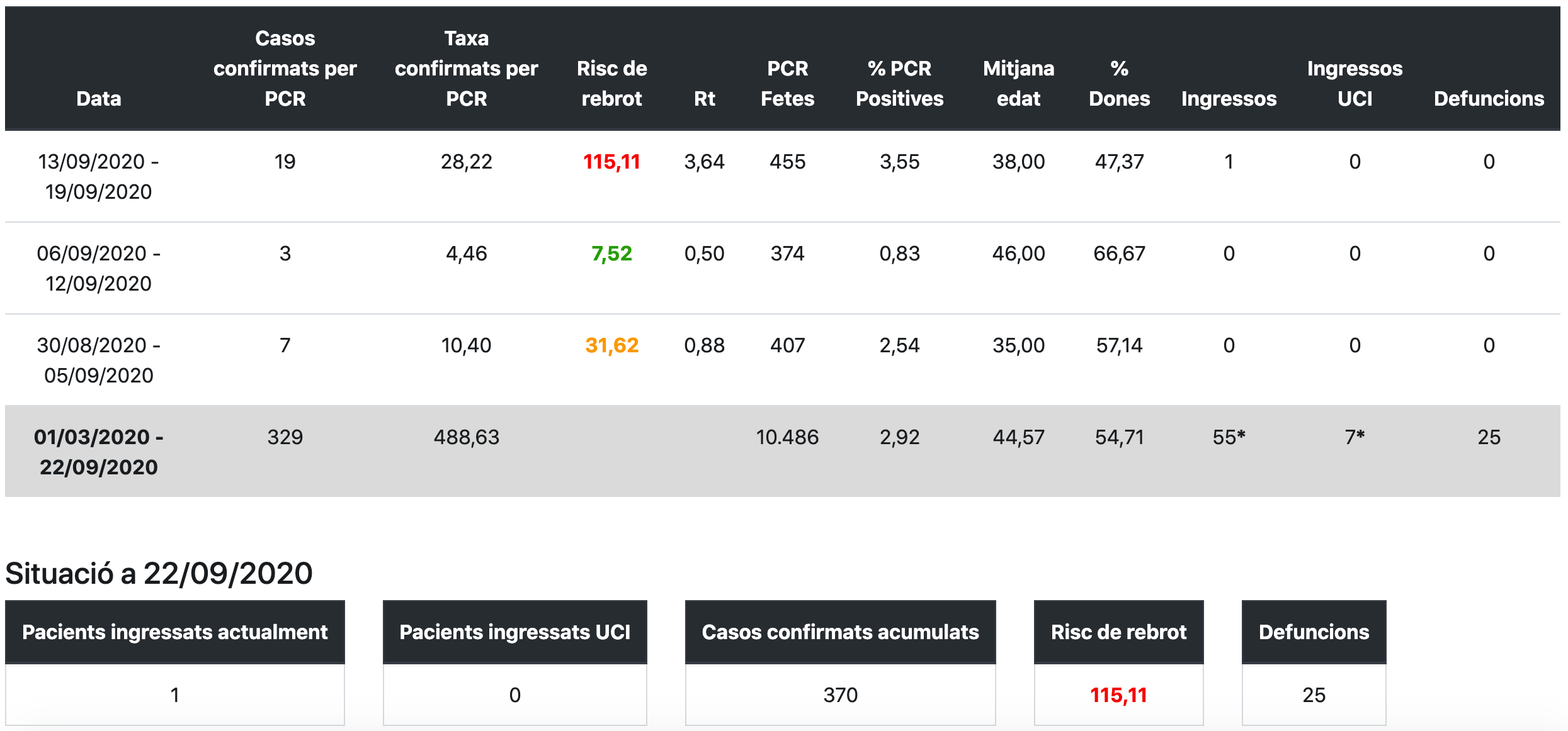 El Montsià acumula, des de l’inici de la pandèmia, 329 casos confirmats per PCR, cap més respecte al balanç anterior, i 370 si es tenen en compte la resta de proves. En aquesta comarca han mort 25 persones. El risc de rebrot anava a la baixa des del passat 17 d’agost i ha durat fins al 13 de setembre, quan s’ha disparat. Actualment el risc de rebrot és de 115,11. Per altra banda, la taxa de confirmats per PCR en els darrers set dies és de 28,22 per 100.000 habitants, mentre que l’Rt, és a dir, la velocitat de reproducció del virus és de 3,64. Segons aquest últim balanç hi ha una persona ingressada a l’hospital, cap a l’UCI.