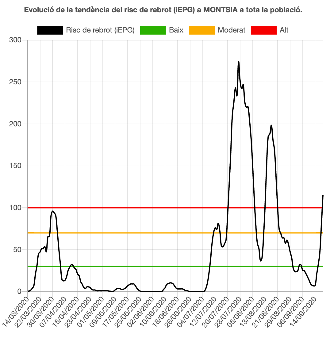 Com es pot comprovar, el Montsià ha passat en una setmana de risc baix (9,63) a risc alt (115,11). Malgrat això el risc alt és a conseqüència del risc de rebot de 3 dels 12 municipis de la comarca. La Ràpita té un risc de rebot mitjà-alt de 71,65, Alcanar també mitjà-alt de 70.43 i Amposta té un risc mitjà-baix de 66.27. Tota la resta de municipis tenen un risc baix de rebrot, Sant Jaume d’Enveja de 13.18, Santa Bàrbara de 7.74, Ulldecona de 6.9 i La Sénia, Masdenverge, Mas de Barberans, Freginals, Godall i La Galera tenen risc zero.