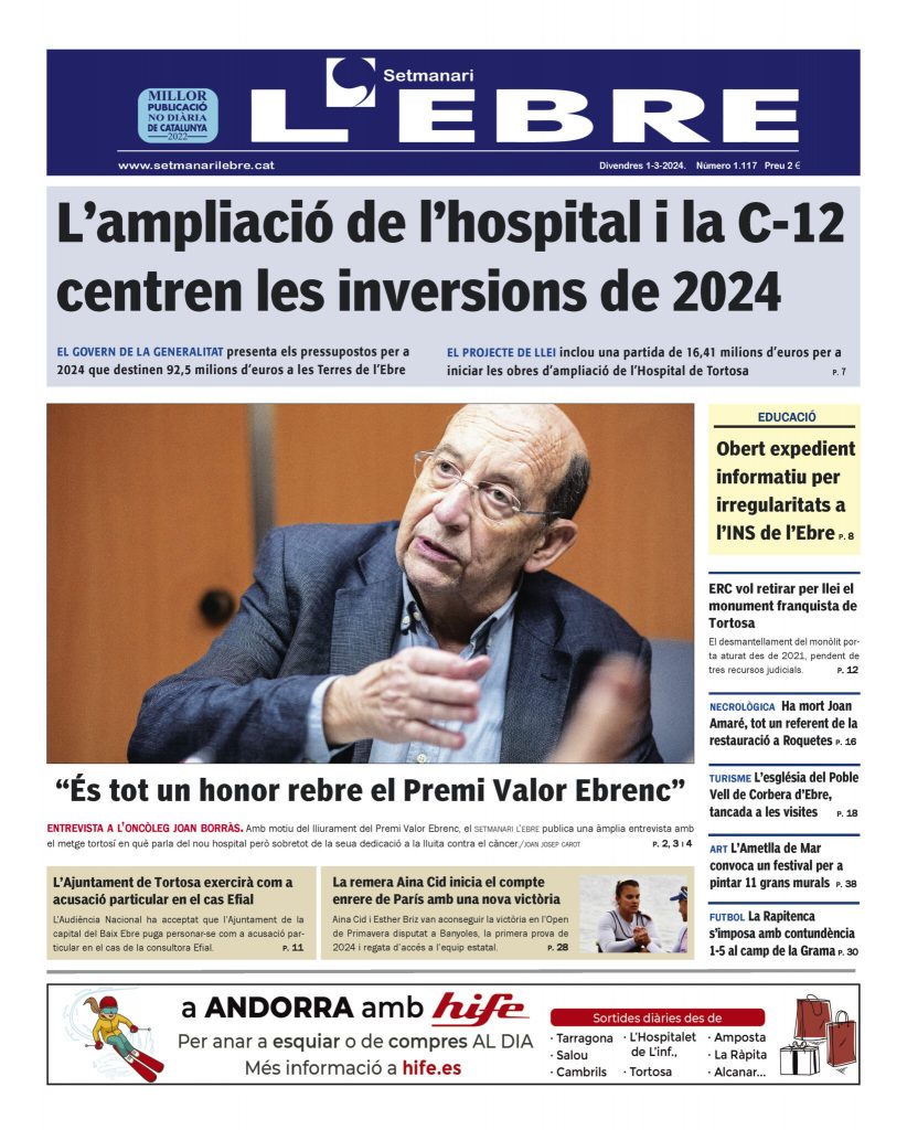 La fotografia de la portada és per al doctor Joan Borràs, l’oncòleg tortosí distingit amb el Premi Valor Ebrenc, que concedeix anualment el setmanari. La publicació setmanal també destaca en portada les irregularitats denunciades a l’Institut de l’Ebre i l’anunci fet per l’Ajuntament de Tortosa que exercirà l’acusació particular en el cas de la consultora Efial.