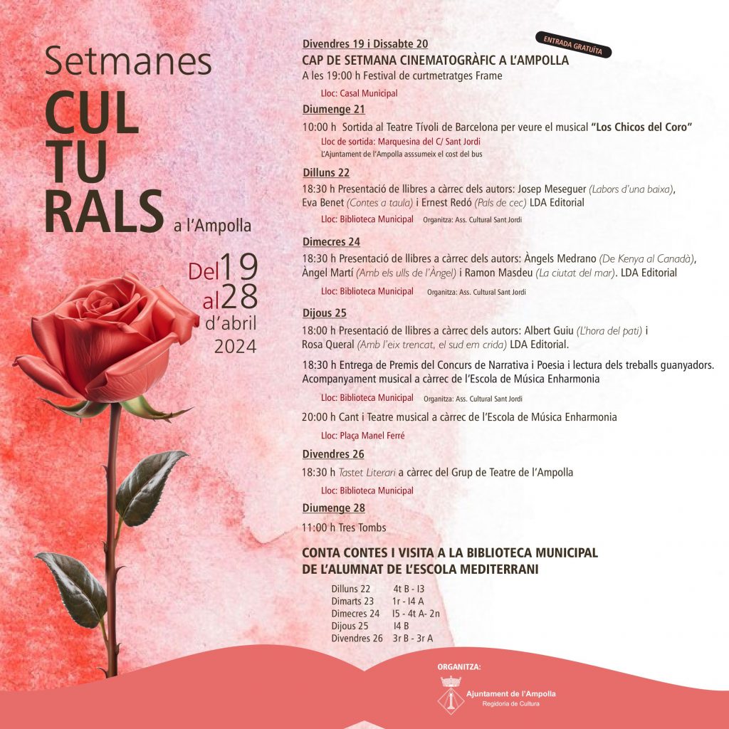 La Regidoria de Cultura de l’Ajuntament de l’Ampolla ha preparat un programa d’activitats culturals per celebrar les Setmanes Culturals 2024, que tindran lloc del 19 al 28 d’abril. Entre els actes hi ha propostes de cinema, teatre, música i lectura.
