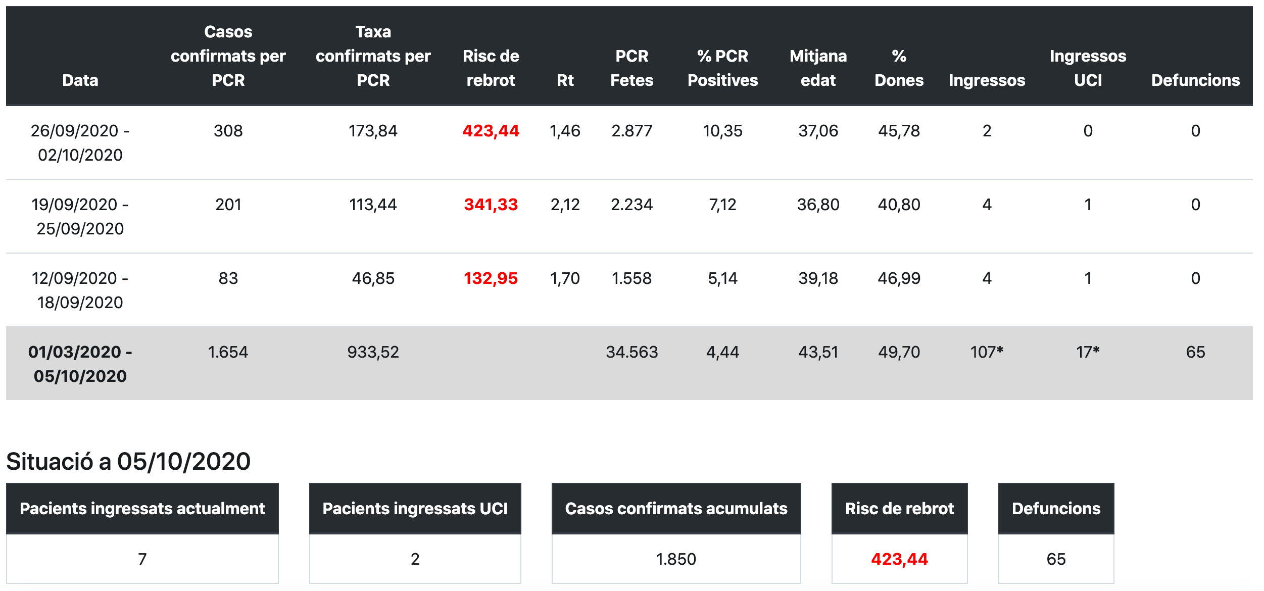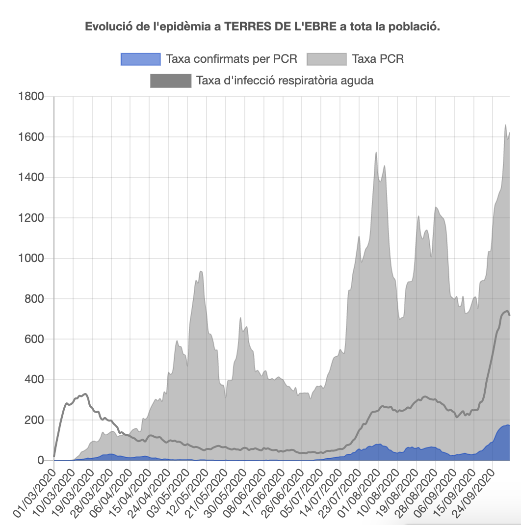 La regió de les Terres de l’Ebre acumula, des de l’inici de la pandèmia, 1.654 casos confirmats per PCR, 31 més que en el balanç anterior, i 1.850 si es tenen en compte la resta de proves, és a dir, en total 33 més. En aquesta regió han mort 65 persones, igual que en l’últim balanç. El risc de rebrot sembla que comença a baixar després d’assolir xifres de rècord i ara és de 423,44, i ha disminuït 34,22 punts si ho comparem amb les dades d’ahir. Malgrat això, continua sent la regió de tot Catalunya amb el risc de rebrot més elevat. Per altra banda, la taxa de confirmats per PCR en els darrers set dies és de 173,84 per 100.000 habitants. La velocitat de reproducció del virus (Rt) baixa i està en 1,46, mentre que la setmana anterior estava en 2,12. Segons l’últim balanç, hi ha 7 pacients ingressats, dos a l’UCI.
