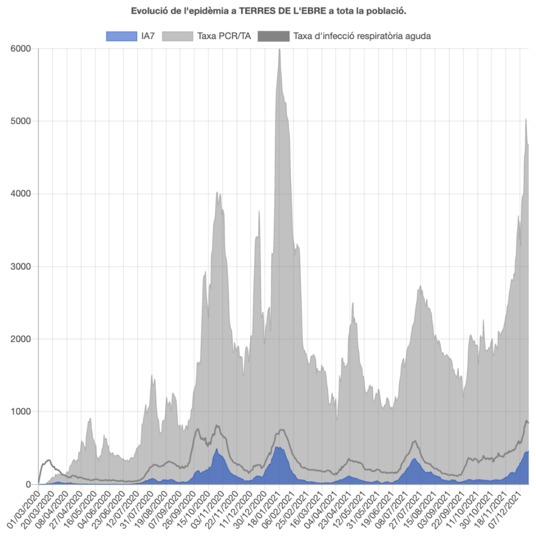 Entre el 13 i el 19 de desembre, que és l’última setmana de la qual es tenen dades fiables, es van registrar 838 positius, i aquesta xifra tan elevada de contagis no es registrava des del mes de gener. Per comarques, el Baix Ebre ha registrat l’última setmana 304 positius, el Montsià 330, la Terra Alta 82 i la Ribera d’Ebre 148.