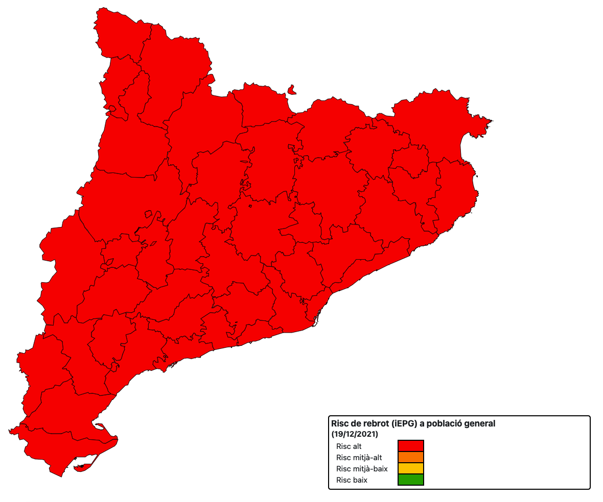La pandèmia segueix disparada, ja que la velocitat de contagi (Rt) supera l’1, però baixa quatre centèsimes respecte ahir fins a 1,10. El risc de rebrot es manté igual, a 938 (risc molt alt). Tenen un risc molt alt les quatre comarques, la Ribera d’Ebre de 1.811, el Montsià de 968, la Terra Alta de 1.539 i el Baix Ebre de 736.