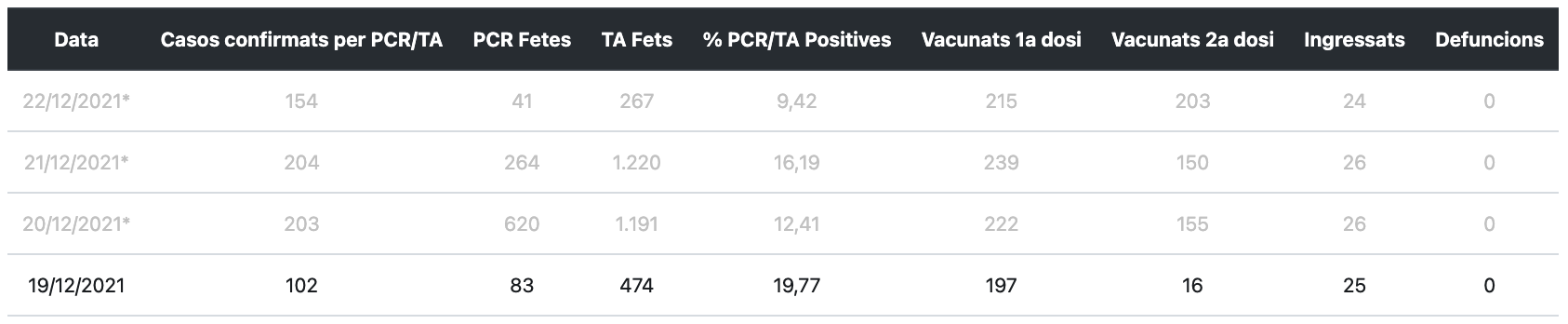 Segons dadescovid.cat, actualment hi ha 40 persones ingressades per Covid-19, dos menys que ahir, 16 de les quals a l’UCI. A les Terres de l’Ebre han mort 197 persones des de l’inici de la pandèmia, cap més. Les dues últimes defuncions daten del 16 i el 17 de desembre. La incidència a 7 dies és de 463 i a 14 dies és de 842. L’11,73% de les proves que es fan donen positiu.