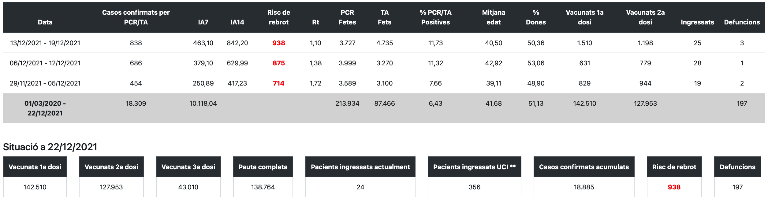 Entre el 13 i el 19 de desembre, que és l’última setmana de la qual es tenen dades fiables, es van registrar 838 positius, i aquesta xifra tan elevada de contagis no es registrava des del mes de gener. Per comarques, el Baix Ebre ha registrat l’última setmana 304 positius, el Montsià 330, la Terra Alta 82 i la Ribera d’Ebre 148.