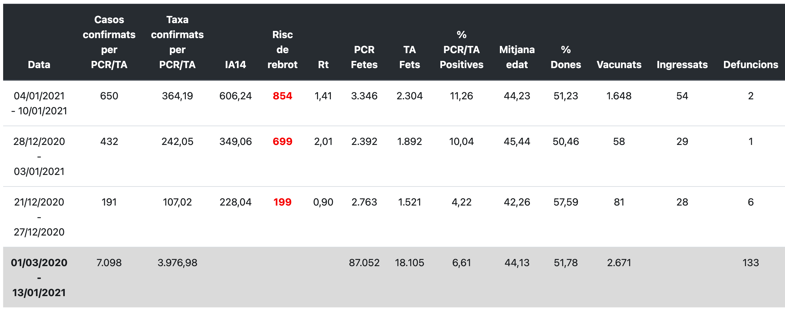La taxa de confirmats per PCR o tests d’antígens entre el 4 i el 10 de gener és de 364,19 per cada 100.000 habitants. L’11,26% de les proves de la darrera setmana han donat positiu. D’altra banda, hi ha hagut dues noves morts i el total és de 133. Hi ha 51 pacients ingressats als hospitals amb Covid-19, 2 menys que fa 24 hores, 14 dels quals a l’UCI, un menys. Entre el 4 i el 10 de gener hi havia 54 ingressats, pels 29 de la setmana anterior. Els vacunats arriben a 2.258, 413 més.