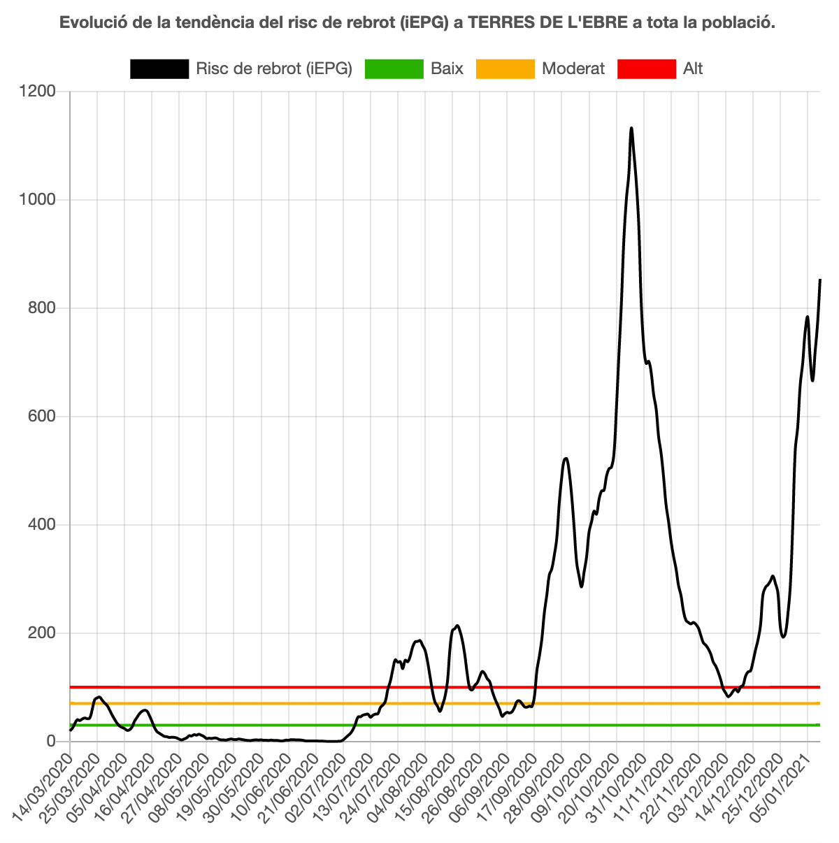 La velocitat de propagació de la Covid-19, l’Rt, ha pujat a 1,41 aquest dijous a les Terres de l’Ebre, vuit centèsimes més que fa 24 hores. El risc de rebrot també puja, ho fa 99 punts, fins als 854. La incidència a 14 dies també s’incrementa i passa de 565,9 a 606,24. S’han declarat 136 nous casos confirmats per PCR o tests d’antígens, cosa que eleva la xifra total a 7.098, 7.356 si es tenen en compte la resta de proves.