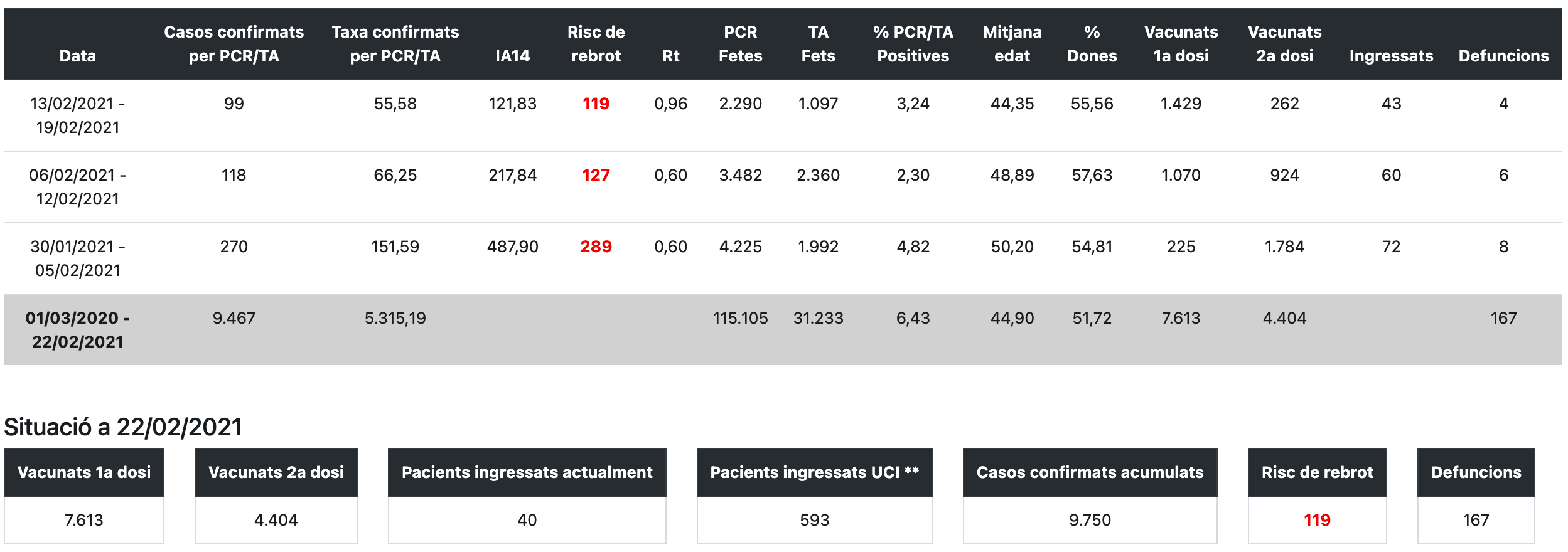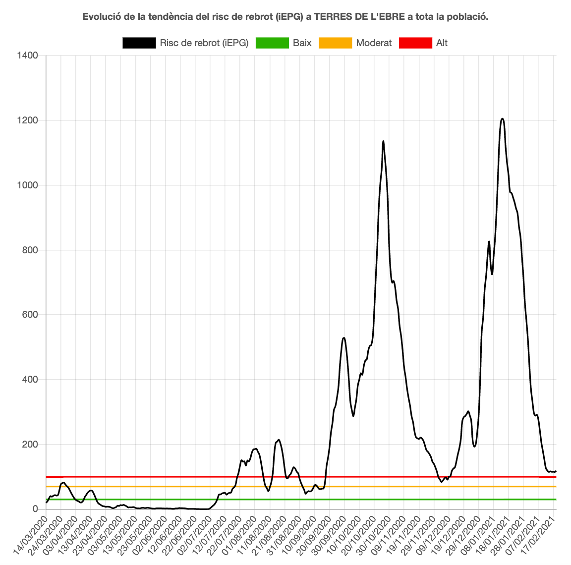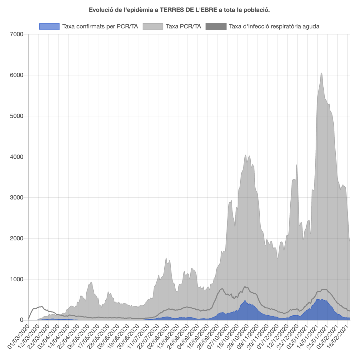 La taxa de confirmats per PCR o tests d’antígens entre el 13 i el 19 de febrer és de 55,58 per cada 100.000 habitants i s’han detectat 99 casos durant aquest període a les comarques ebrenques. El 3,24% de les proves de la darrera setmana han donat positiu. L’Organització Mundial de la Salut (OMS) considera que l’ideal és que el percentatge de proves positives se situï per sota del 5%, però en aquesta tercera onada s’havia arribat al 12,58% a les Terres de l’Ebre, concretament a començaments de gener.
