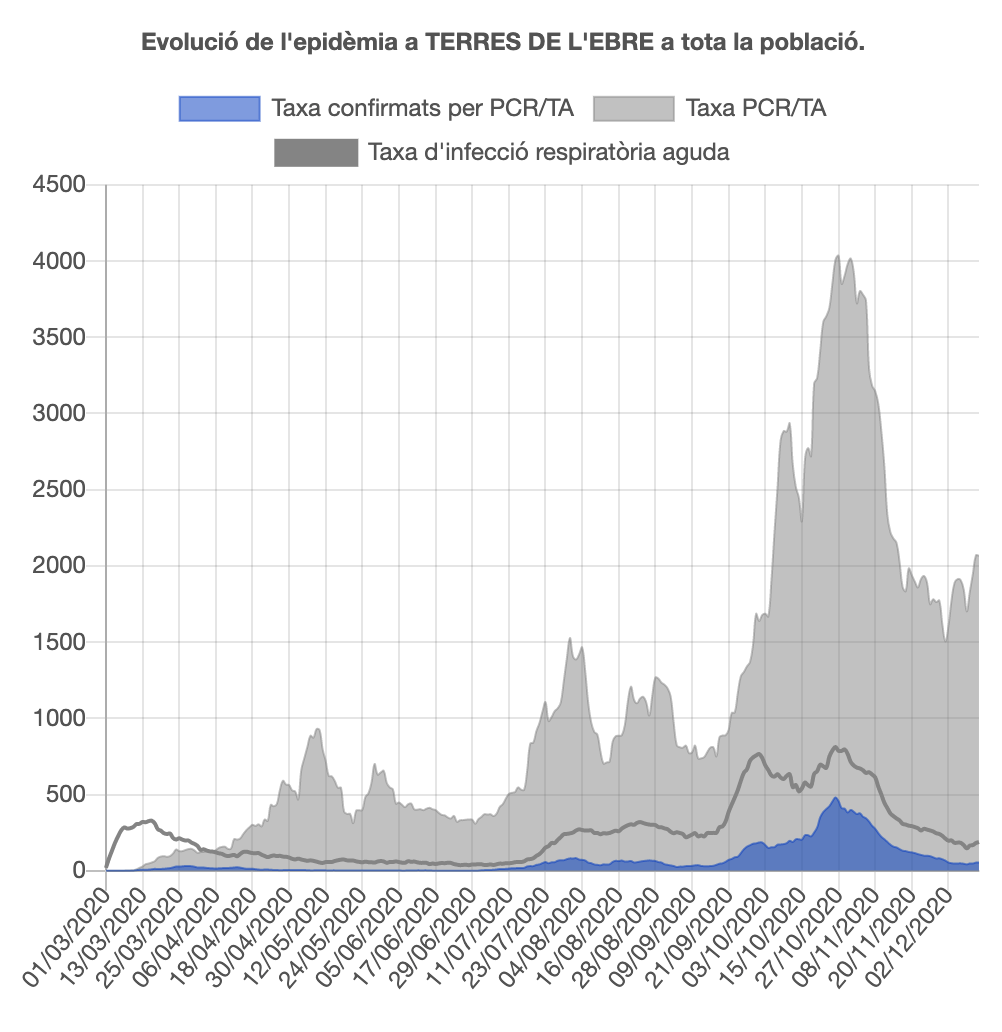 La regió sanitària de les Terres de l’Ebre acumula, des de l’inici de la pandèmia, 5.274 casos confirmats per PCR o antígens, 26 més que en el balanç anterior, i 5.511 si es tenen en compte la resta de proves. En aquesta regió han mort 122 persones, cap més respecte ahir. Entre el 6 i el 12 de desembre es va notificar dues defuncions, per les cinc de l’interval anterior.