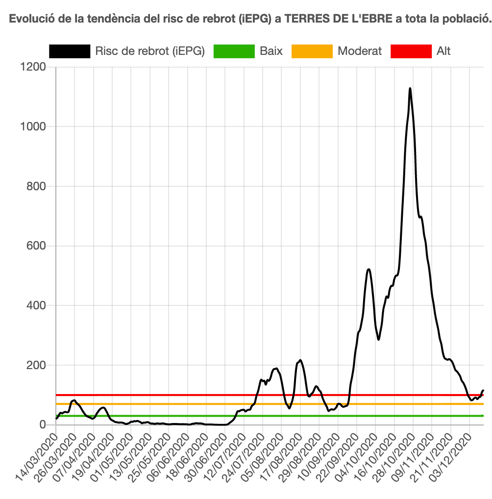 El risc de rebrot puja 11 punts i se situa en 117, per sobre del de la setmana anterior, quan era de 84. Per altra banda, la taxa de confirmats per PCR o test d’antígens entre el 6 i el 12 de desembre és de 54,51 per cada 100.000 habitants. La incidència a 14 dies és de 102,27, pels 128,12 de la setmana anterior. El 2,68% de les proves que es fan donen positiu.