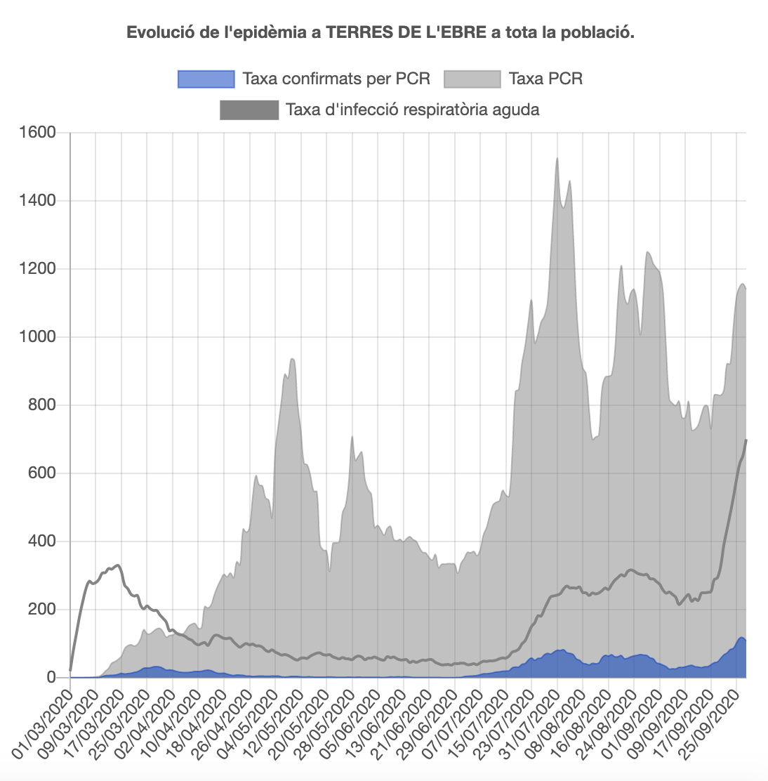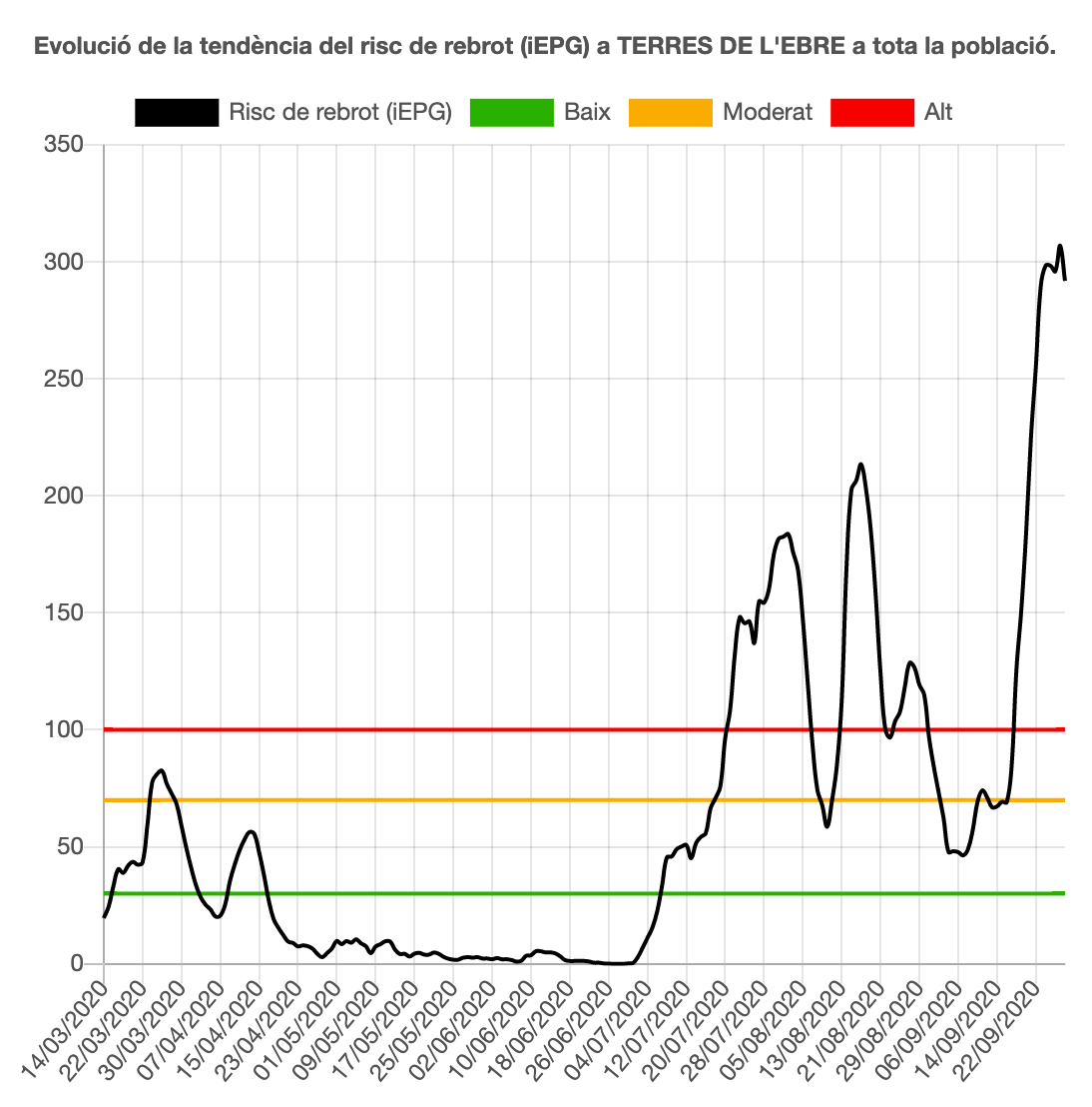 La regió de les Terres de l’Ebre acumula 1.371 casos confirmats per PCR i 1.565 si es tenen en compte la resta de proves, és a dir, un més que en el balanç anterior. En aquesta regió han mort 65 persones, cap més respecte a l’últim balanç. El risc de rebrot disminueix una mica respecte ahir i se situa per sota de 300, a 291,80 (risc molt alt), i és el més elevat de tot Catalunya. Per darrere les Terres de l’Ebre se situen l’Alt Pirineu i Aran amb un risc de 270,12 i la Catalunya Central (226,12).