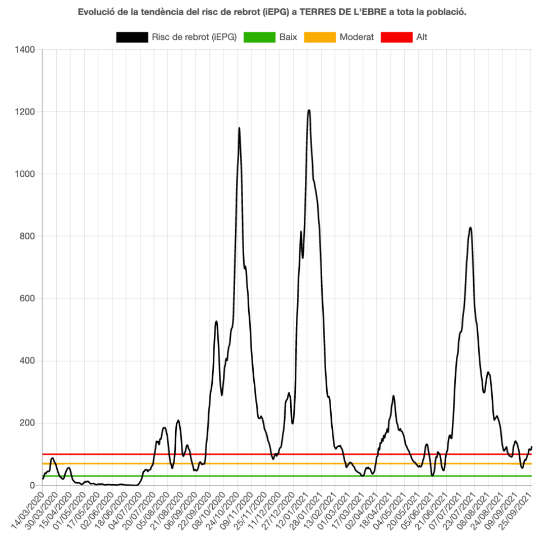 La velocitat de contagi (Rt) és superior a l’1, per tant, la pandèmia augmenta, però baixa tres centèsimes i se situa a l’1,34. El risc de rebrot puja 11 punts fins a 125, risc alt. Té un risc baix la Ribera d’Ebre (0), mitjà-alt al Montsià (95) i alt a la Terra Alta (119) i al Baix Ebre (190).