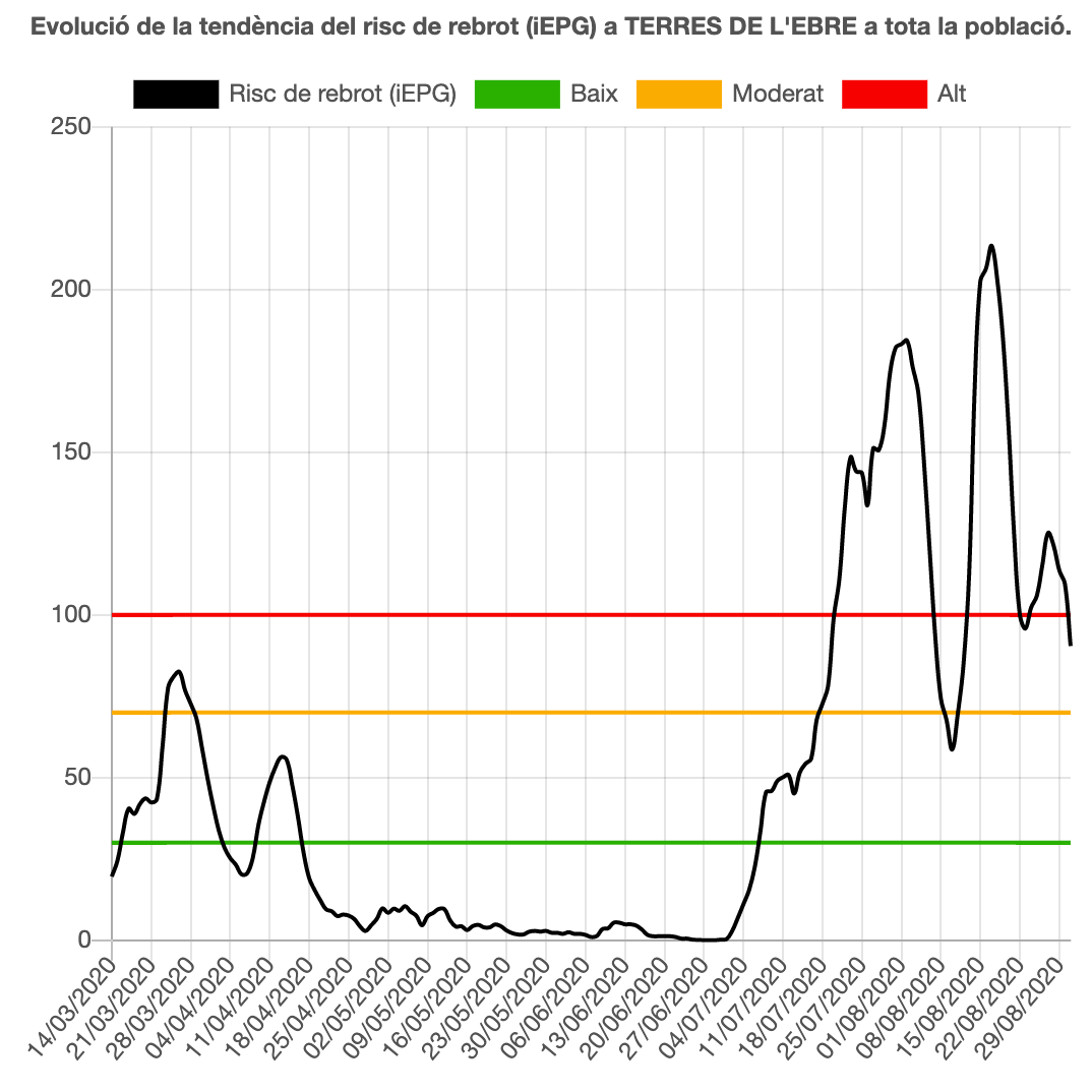 La regió de les Terres de l’Ebre acumula, des de l’inici de la pandèmia, 950 casos confirmats per PCR (16 més que en el balanç anterior) i 1.129 si es tenen en compte la resta de proves. En aquesta regió han mort 64 persones en total. El risc de rebrot se situa en un nivell mitjà, a 90,42, i comparant amb les dades d’ahir ha disminuit 9,78 punts. Per altra banda, la taxa de confirmats per PCR en els darrers set dies és de 40,64 per 100.000 habitants, mentre que la taxa de reproducció del virus disminueix 0,05 i se situa per sota d’1, a 0,94. Segons l’últim balanç hi ha 10 pacients ingressats als hospitals, dos més que ahir, un dels quals l’UCI.