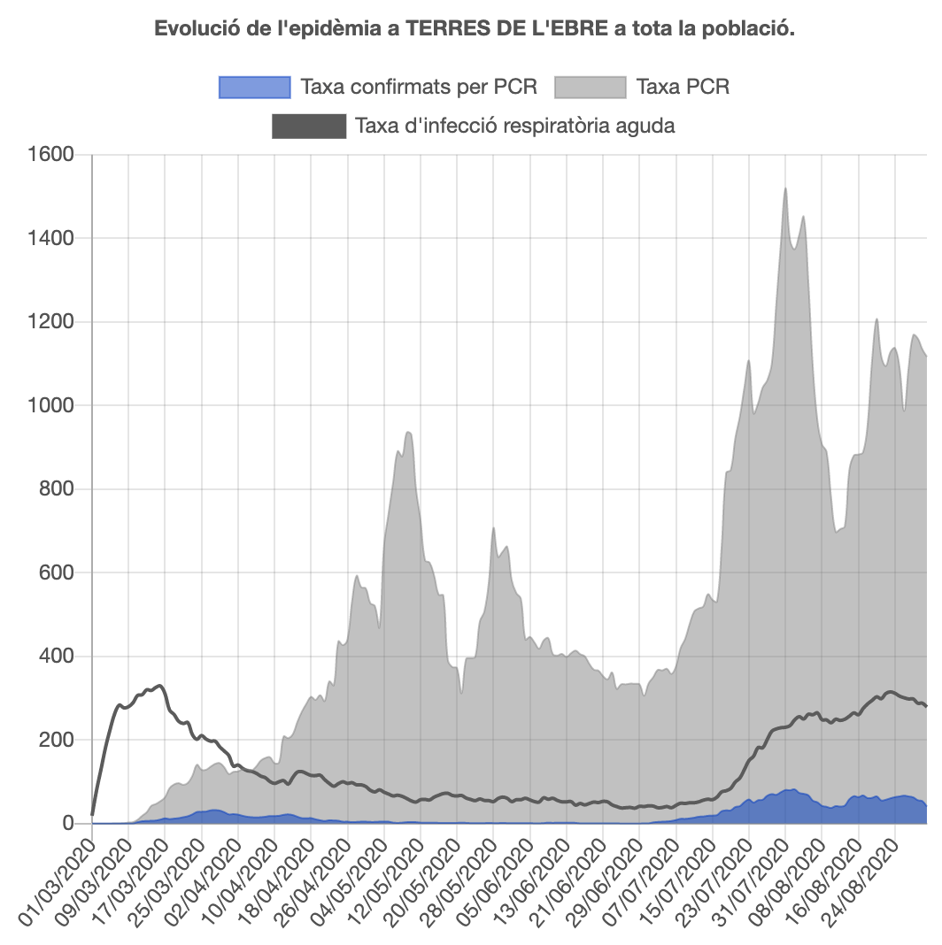 La regió de les Terres de l’Ebre acumula, des de l’inici de la pandèmia, 950 casos confirmats per PCR (16 més que en el balanç anterior) i 1.129 si es tenen en compte la resta de proves. En aquesta regió han mort 64 persones en total. El risc de rebrot se situa en un nivell mitjà, a 90,42, i comparant amb les dades d’ahir ha disminuit 9,78 punts. Per altra banda, la taxa de confirmats per PCR en els darrers set dies és de 40,64 per 100.000 habitants, mentre que la taxa de reproducció del virus disminueix 0,05 i se situa per sota d’1, a 0,94. Segons l’últim balanç hi ha 10 pacients ingressats als hospitals, dos més que ahir, un dels quals l’UCI.