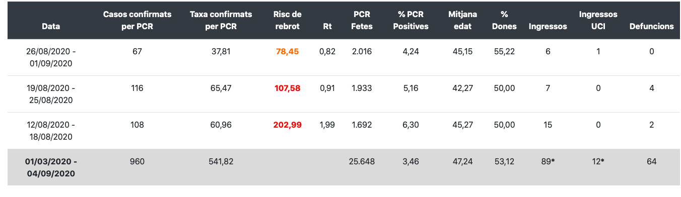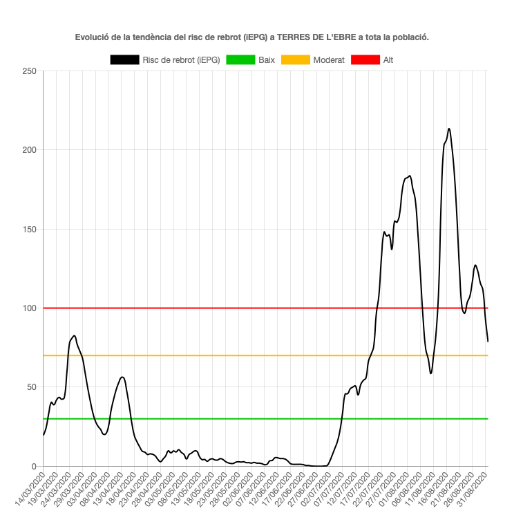 La regió de les Terres de l’Ebre acumula, des de l’inici de la pandèmia, 960 casos confirmats per PCR (10 més que en el balanç anterior) i 1.139 si es tenen en compte la resta de proves. En aquesta regió han mort 64 persones en total. El risc de rebrot se situa en un nivell mitjà, a 78,45, i comparant amb les dades d’ahir ha disminuit 11,97 punts. Per altra banda, la taxa de confirmats per PCR en els darrers set dies és de 37,81 per 100.000 habitants, mentre que la taxa de reproducció del virus disminueix 0,12 i se situa per sota de 0,94, a 0,82. Segons l’últim balanç hi ha 13 pacients ingressats als hospitals, tres més que ahir, dos dels quals l’UCI.