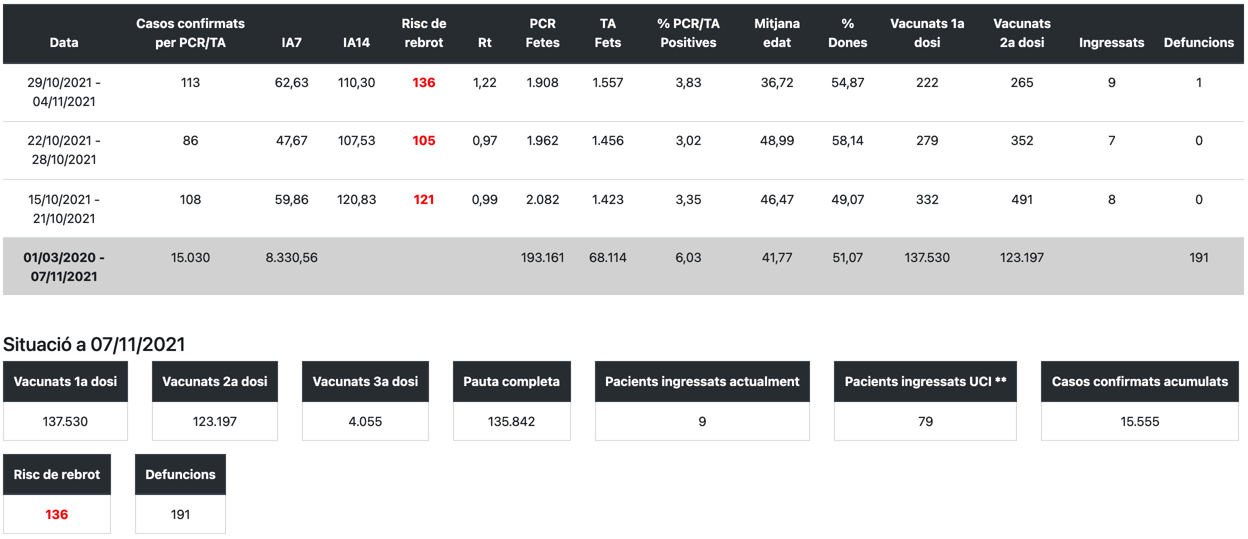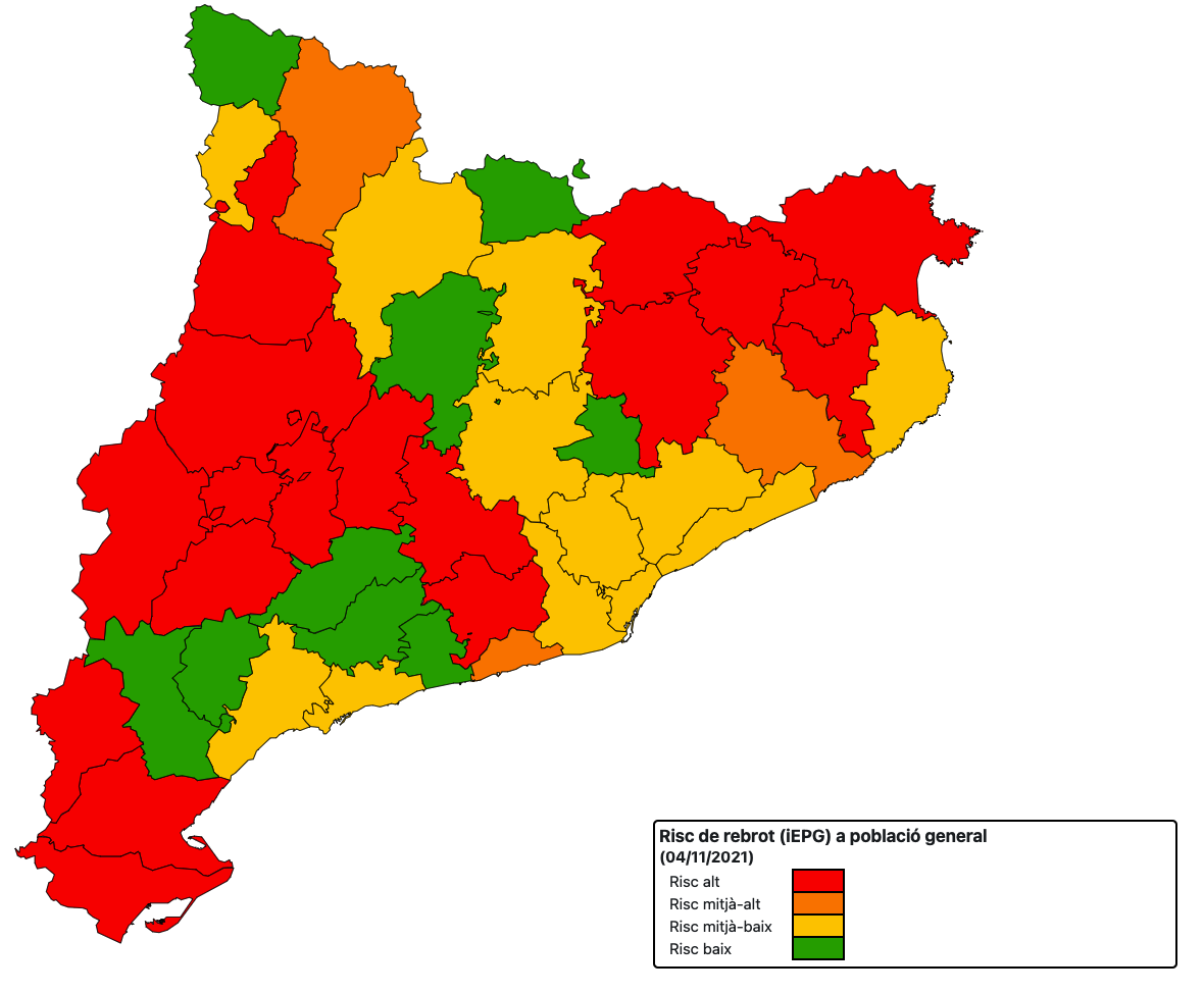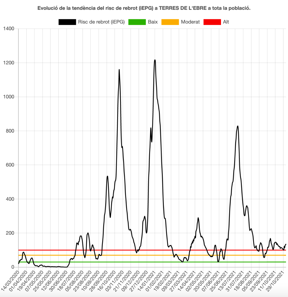 La pandèmia de la Covid-19 augmenta, ja que la velocitat de contagi (Rt) és superior a l’1 i, en concret, puja 12 centèsimes fins a 1,22. El risc de rebrot puja 15 punts fins a 136, risc alt. Té un risc baix la Ribera d’Ebre (12), alt al Baix Ebre (167) i el Montsià (149) i molt alt la Terra Alta (204).