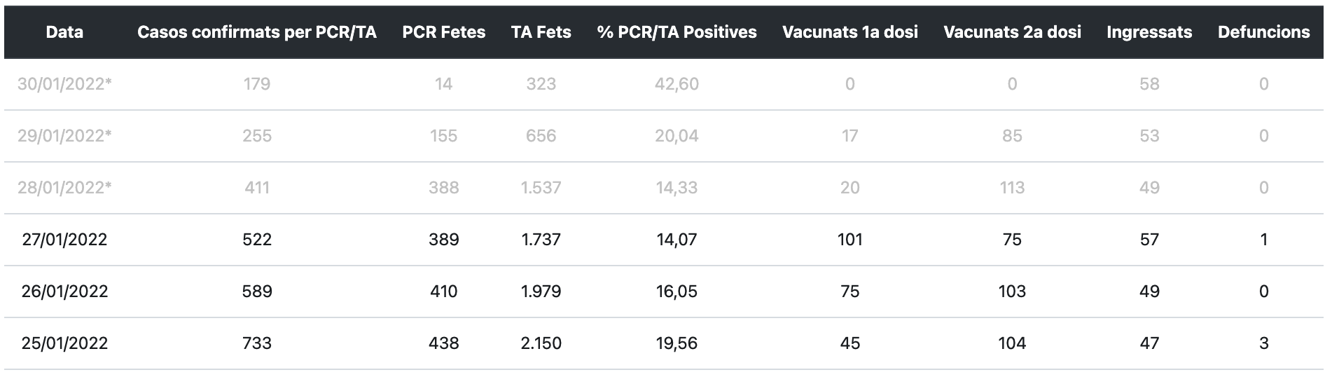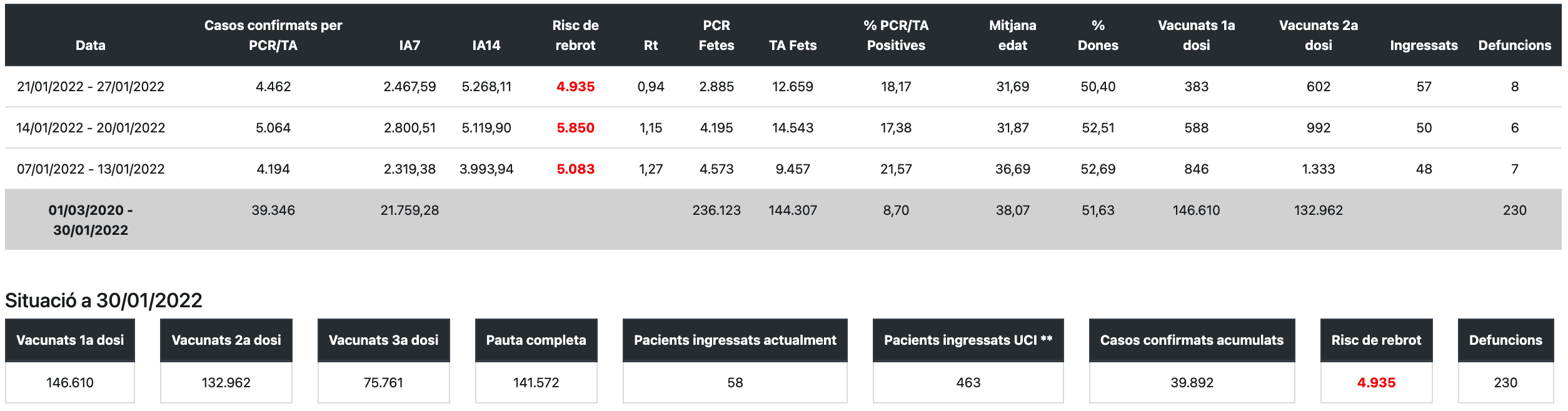 Segons dadescovid.cat, actualment hi ha 72 persones ingressades per Covid-19, 14 de les quals a l’UCI. A les Terres de l’Ebre han mort 230 persones des de l’inici de la pandèmia, cap més. Les últimes defuncions daten del 25 i el 27 de gener. La incidència a 7 dies és de 2.468 i a 14 dies és de 5.268. El 18,17% de les proves que es fan donen positiu.