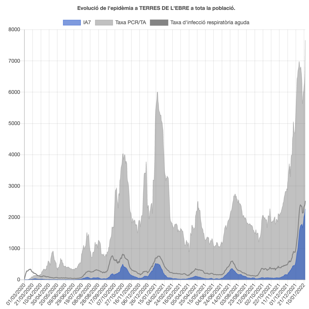 Entre el 7 i el 13 gener, que és l’última setmana de la qual es tenen dades fiables, es van registrar 4.086, més que la setmana anterior, quan se’n van detectar 2.995. Per comarques, el Baix Ebre ha registrat l’última setmana 1.790 positius, el Montsià 1.730, la Terra Alta 213 i la Ribera d’Ebre 350.