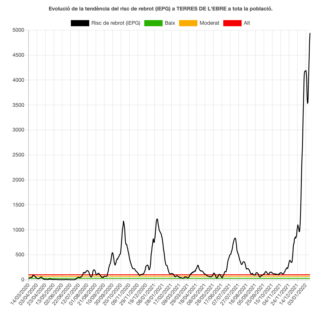La pandèmia segueix en augment, ja que la velocitat de contagi (Rt) supera l’1 i puja quatre centèsimes fins a 1,25 i el risc de rebrot puja 173 punts, fins a 4.944 (risc molt alt). Un risc que no s’havia registrat mai. Tenen un risc molt alt les quatre comarques: la Ribera d’Ebre de 3.739, el Montsià de 5.610, la Terra Alta de 4.403 i el Baix Ebre de 4.875.